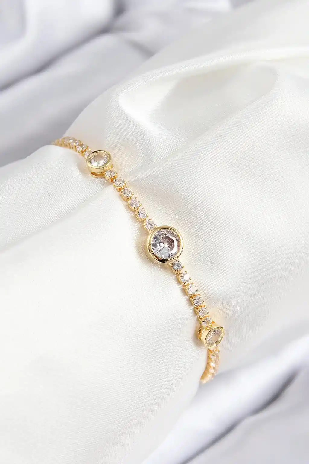 Pirinç Zirkon Taşlı Daire Model Gold Renk Asansörlü Kadın Bileklik