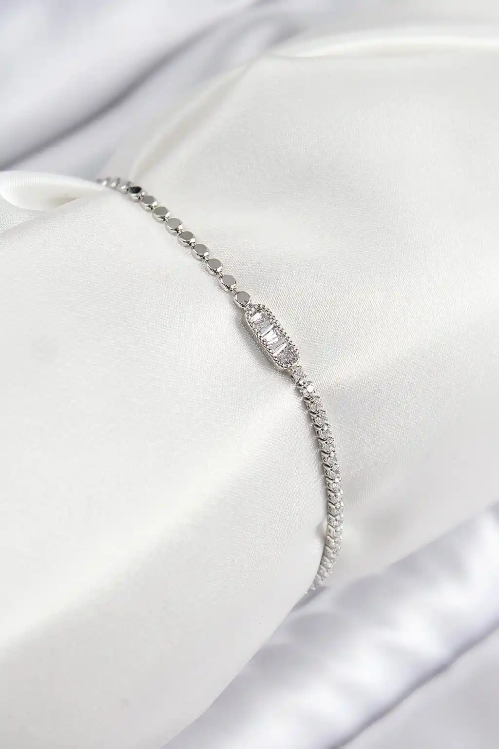 Pirinç Zirkon Taşlı Dikdörtgen Model Ezme Zincir Gümüş Renk Kadın Bileklik