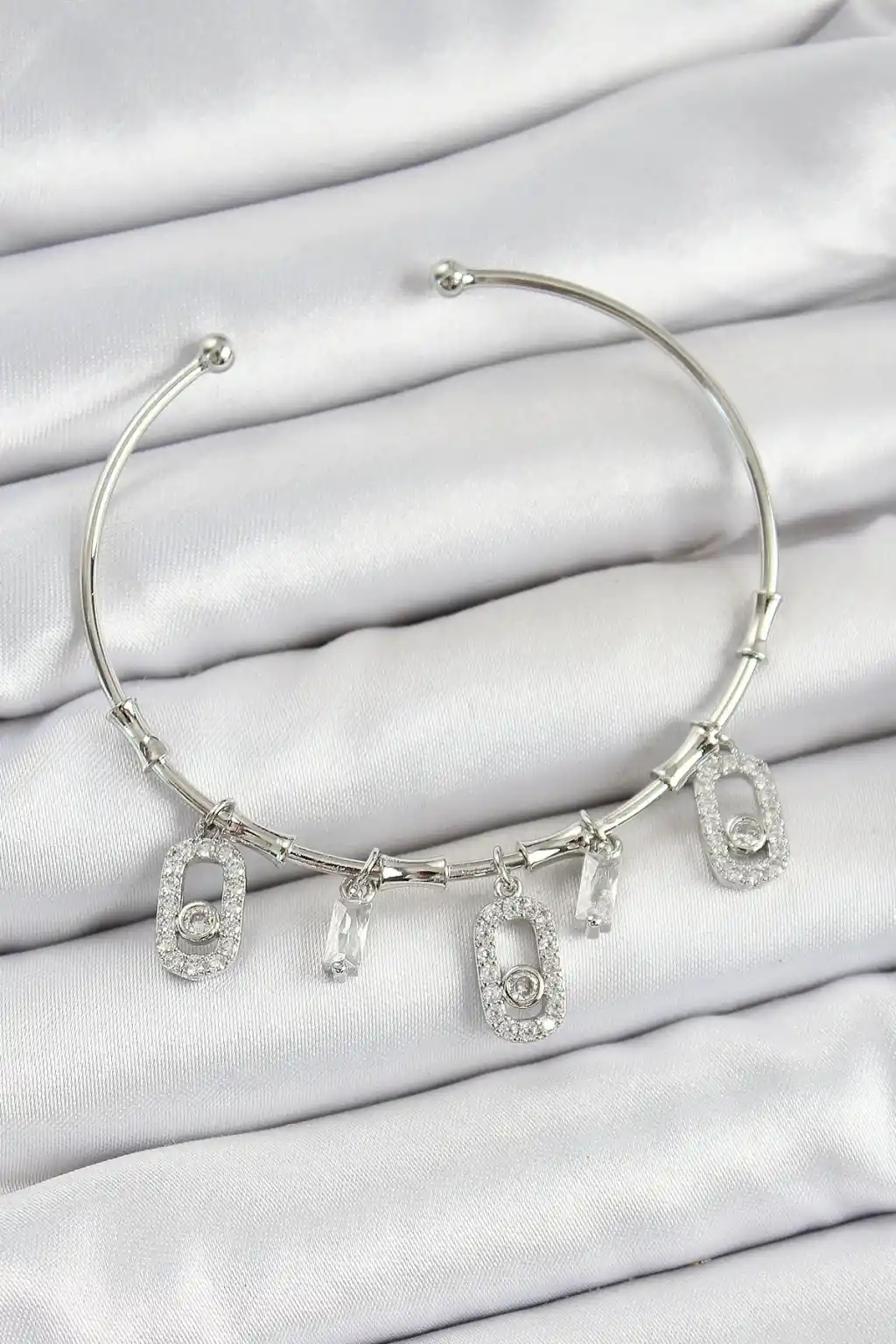 Pirinç Zirkon Taşlı Dikdörtgen Model Gümüş Renk Charm Bileklik