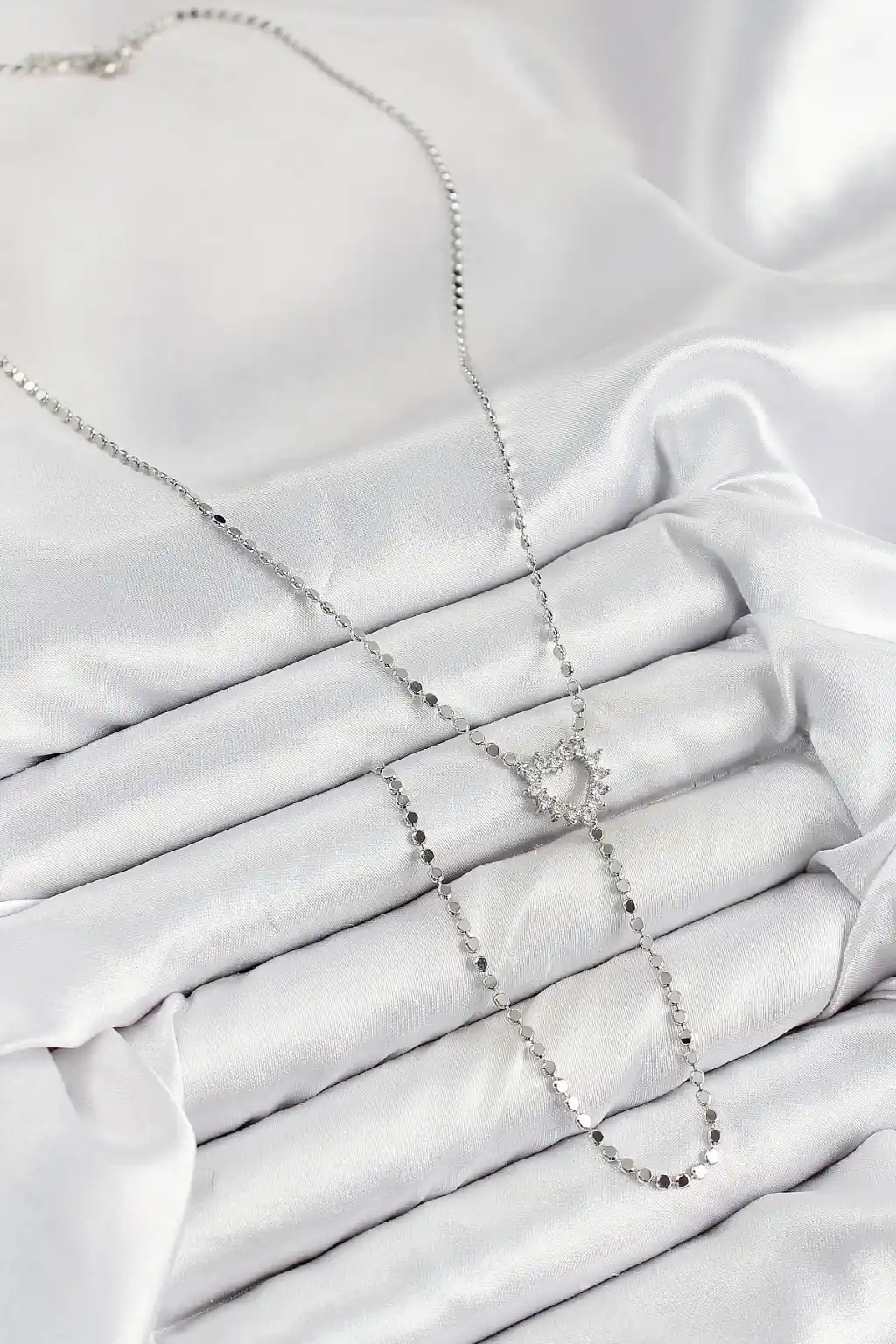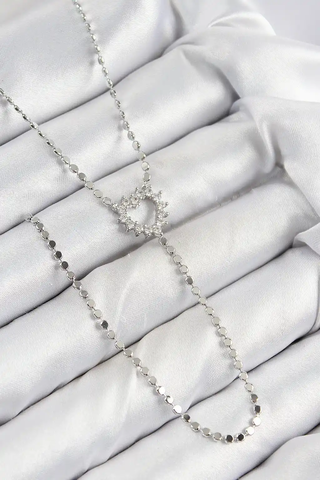 Pirinç Zirkon Taşlı Ezme Zincirli Kalp Model Gümüş Renk Y Kolye