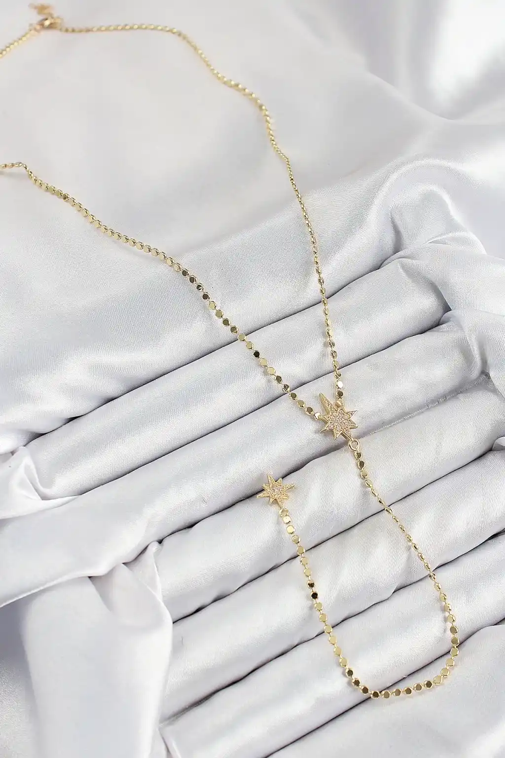 Pirinç Zirkon Taşlı Ezme Zincirli Kutup Yıldızı Model Gold Renk Y Kolye