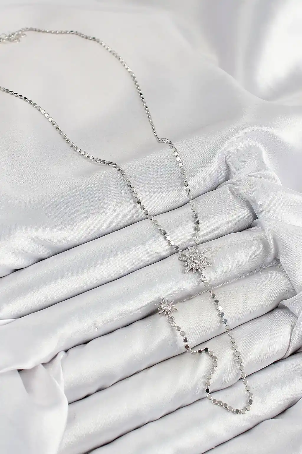 Pirinç Zirkon Taşlı Ezme Zincirli Kutup Yıldızı Model Gümüş Renk Y Kolye