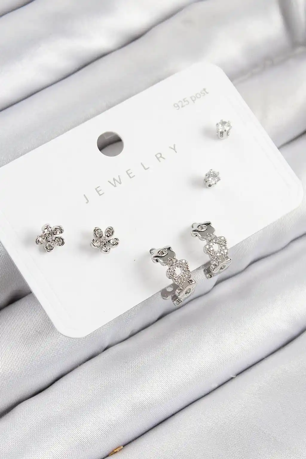 Pirinç Zirkon Taşlı Halka Model Gümüş Renk 925 Ayar Gümüş Çivi Kadın Küpe Set