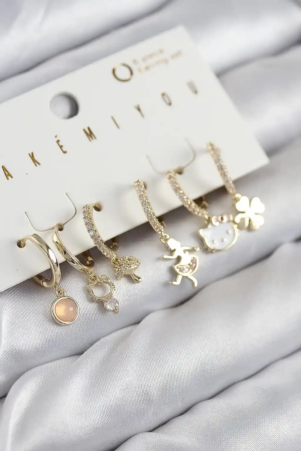 Pirinç Zirkon Taşlı Hello Kity Ve Yonca Model Gold Renk 6'lı Küpe Set