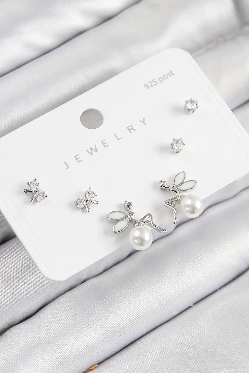 Pirinç Zirkon Taşlı İnci Melek Model Gümüş Renk 925 Ayar Gümüş Çivi Kadın Küpe Set