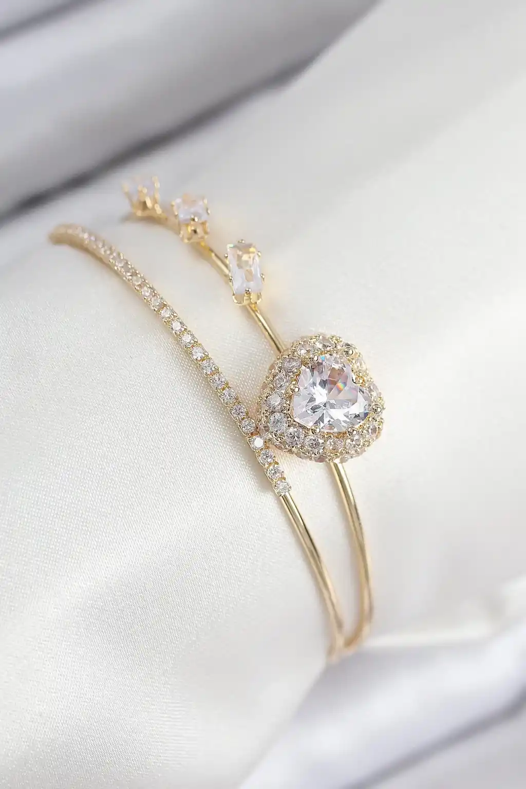 Pirinç Zirkon Taşlı Kalp Model Gold Renk Kadın Bileklik