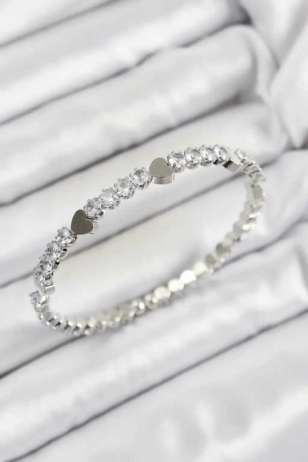 Pirinç Zirkon Taşlı Kalp Model Gümüş Renk Yaylı Kadın Bileklik