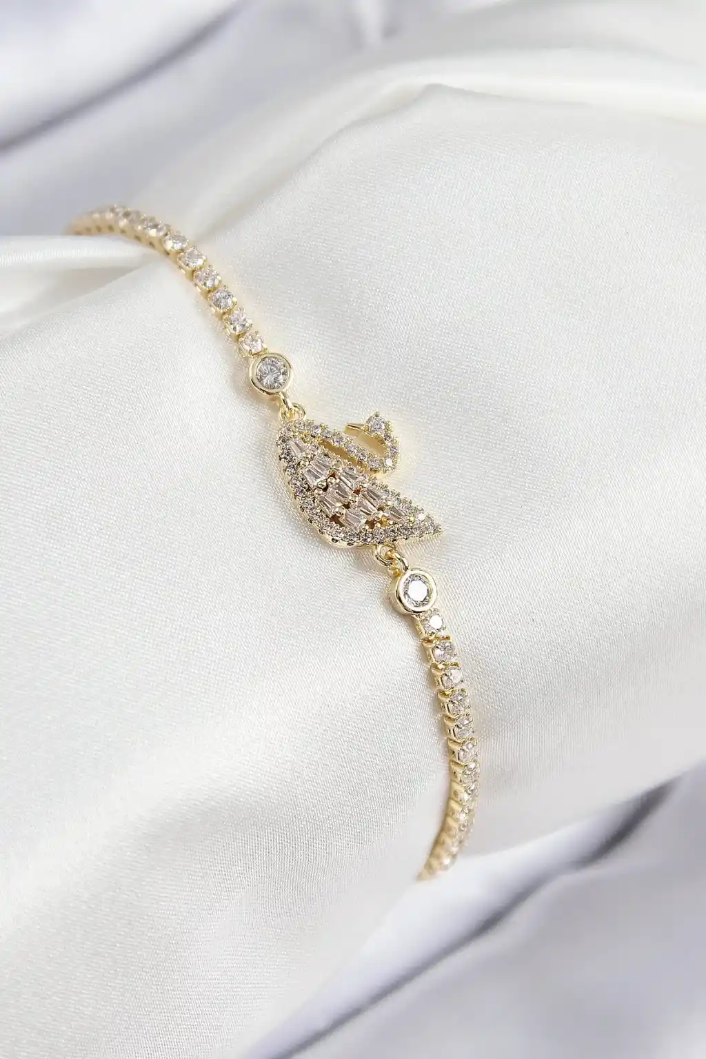 Pirinç Zirkon Taşlı Kuğu Model Gold Renk Kadın Bileklik