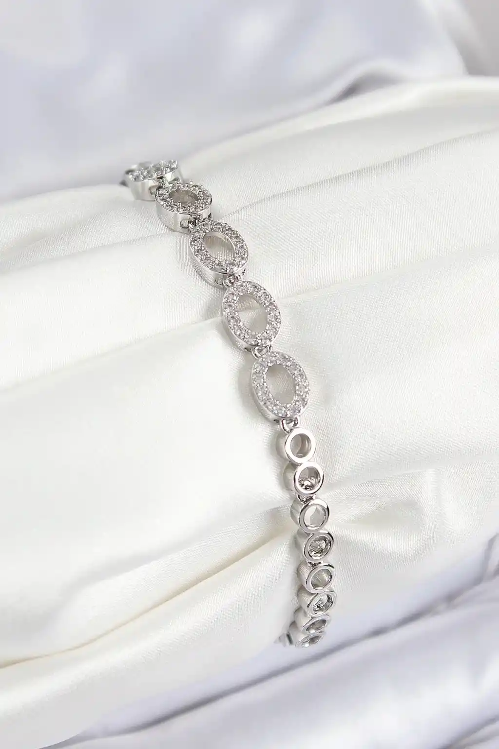 Pirinç Zirkon Taşlı Oval Model Gümüş Renk Kadın Bileklik