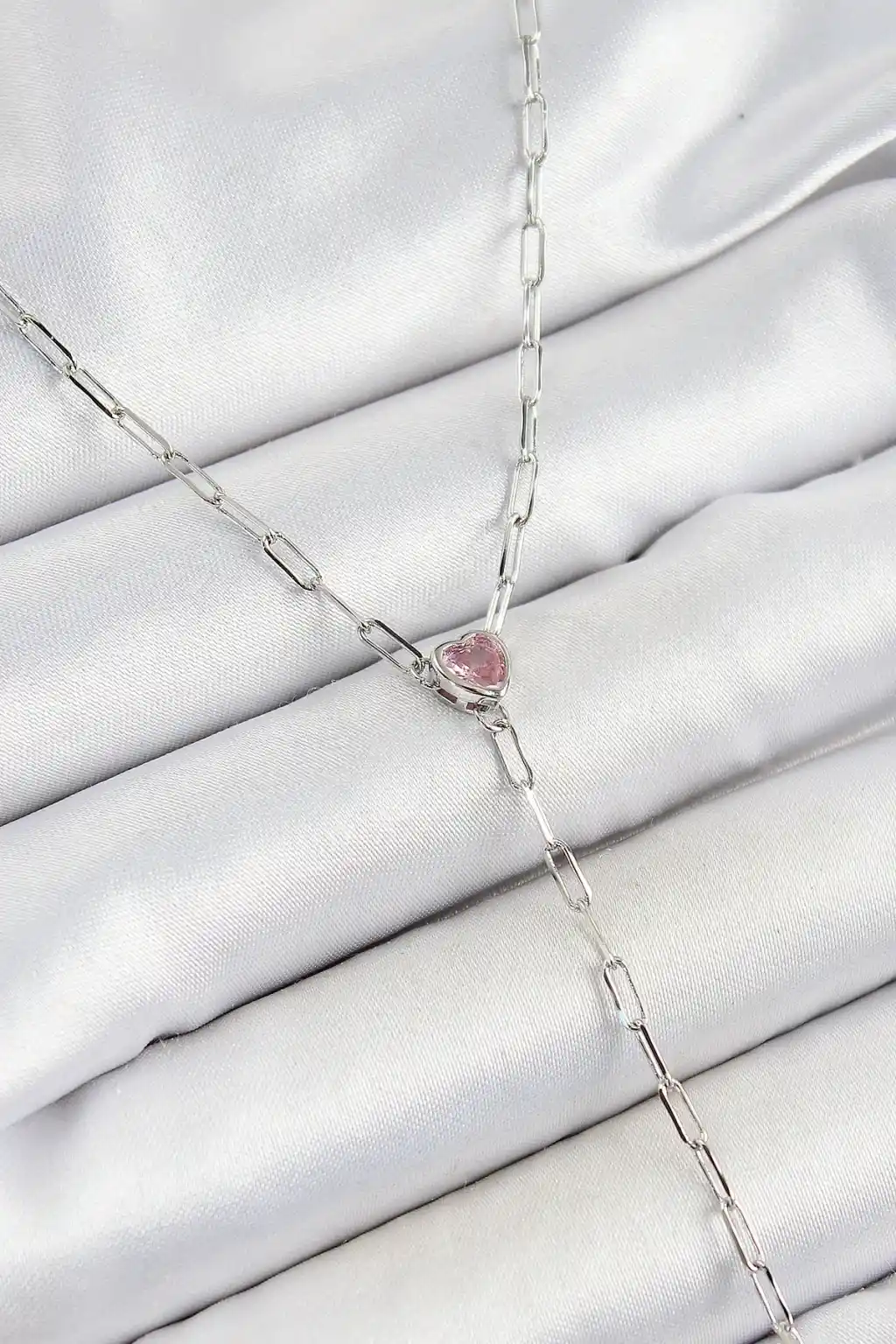 Pirinç Zirkon Taşlı Pembe Kalp Figürlü Y Model Gümüş Renk Kadın Kolye