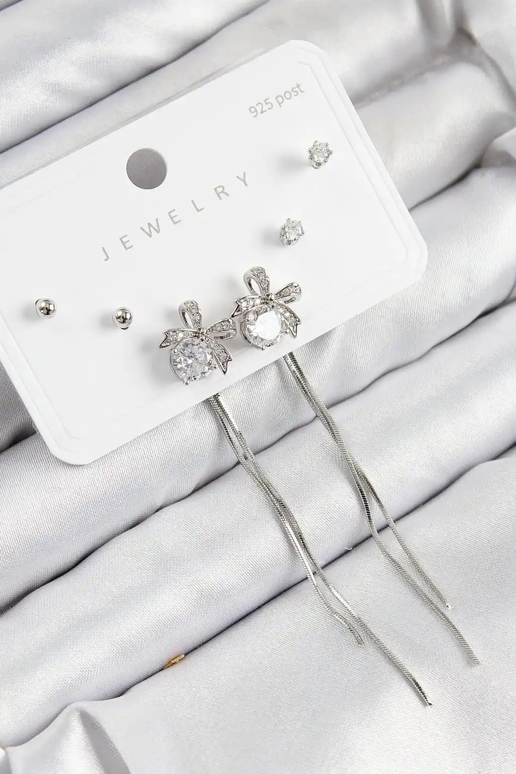 Pirinç Zirkon Taşlı Sallantılı Fiyonk Model Gümüş Renk 925 Ayar Gümüş Çivi Kadın Küpe Set