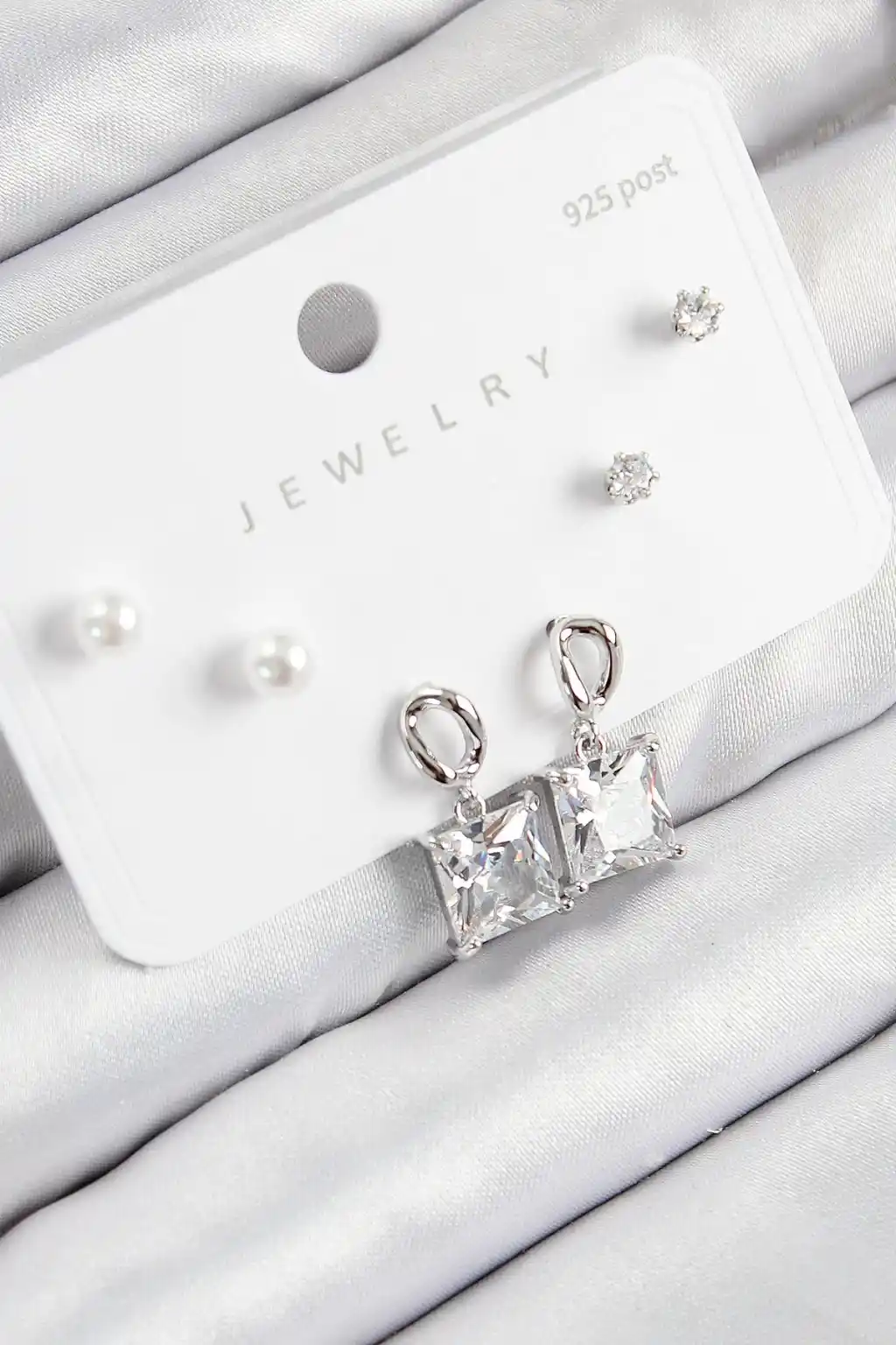 Pirinç Zirkon Taşlı Sallantılı Kare Model Gümüş Renk 925 Ayar Gümüş Çivi Kadın Küpe Set