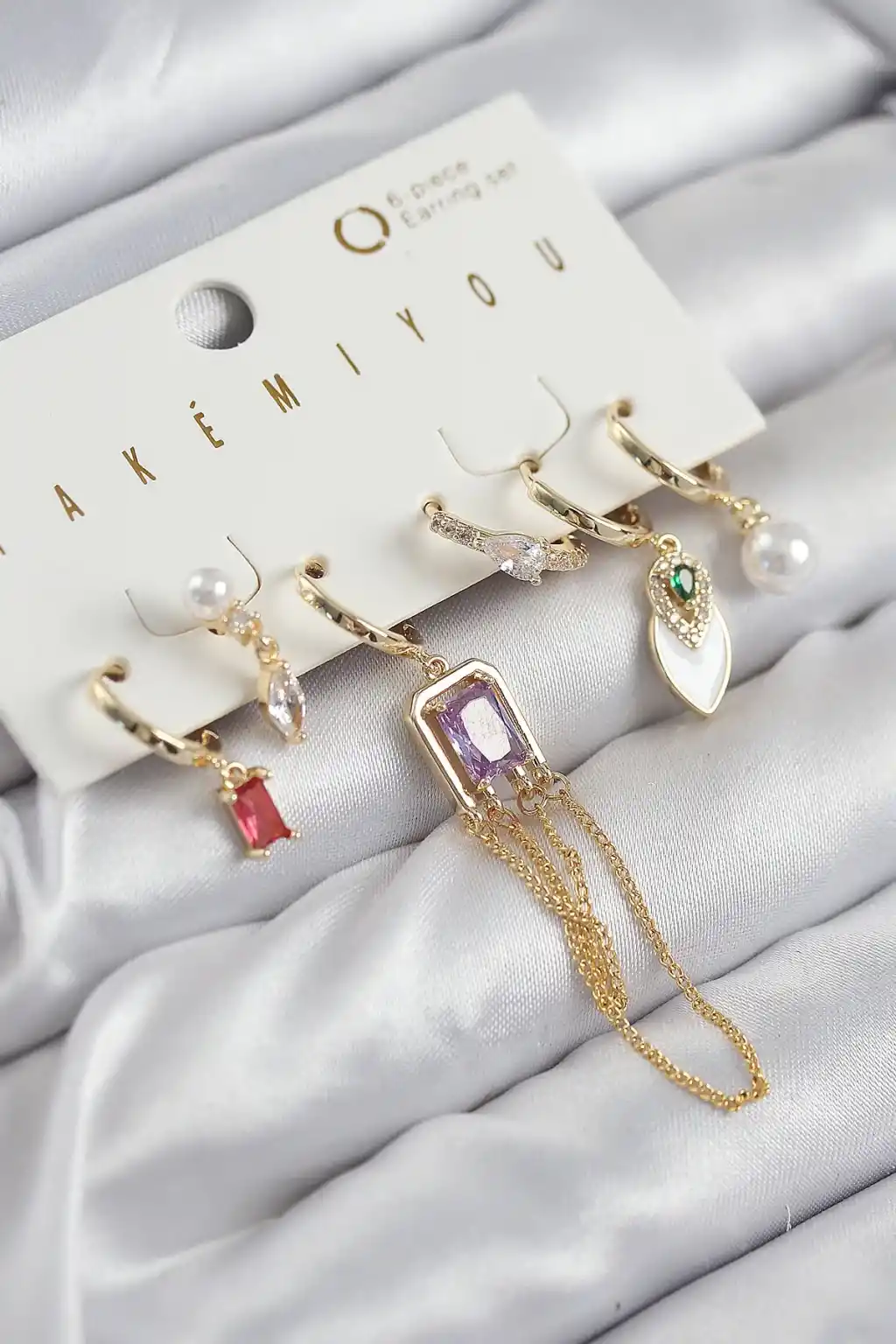 Pirinç Zirkon Taşlı Sallantılı Ve İncili Gold Renk 6'lı Küpe Set