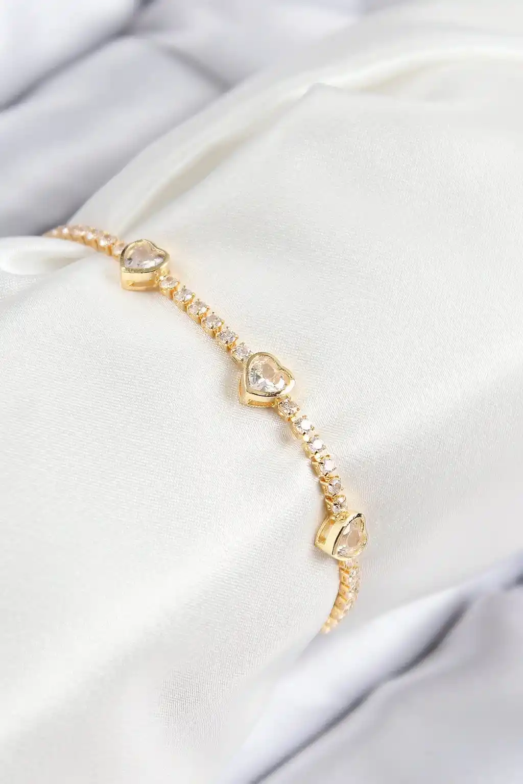 Pirinç Zirkon Taşlı Sıralı Kalp Model Gold Renk Kadın Bileklik