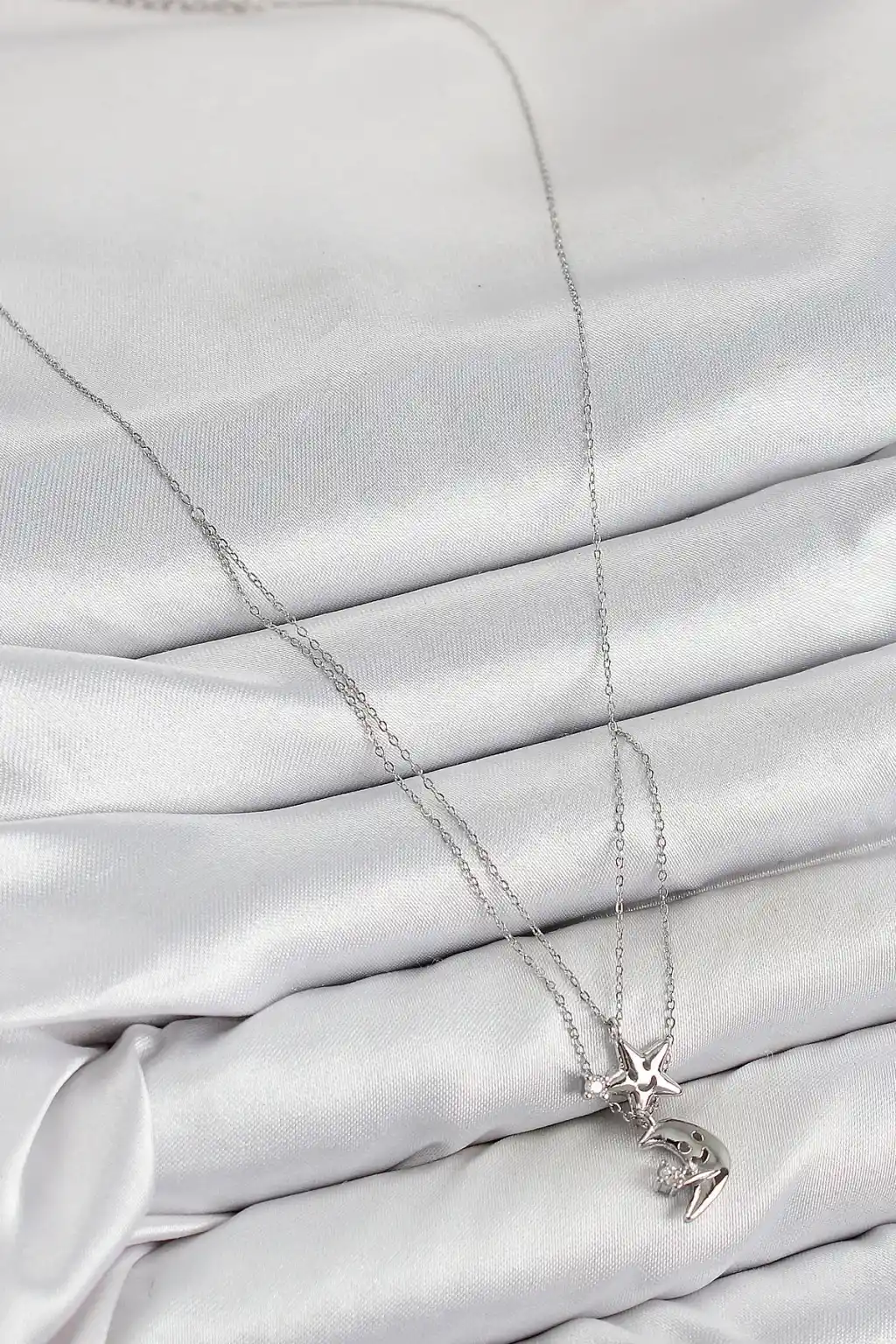 Pirinç Zirkon Taşlı Yıldız Ve Ay Model Gümüş Renk Kadın Kolye
