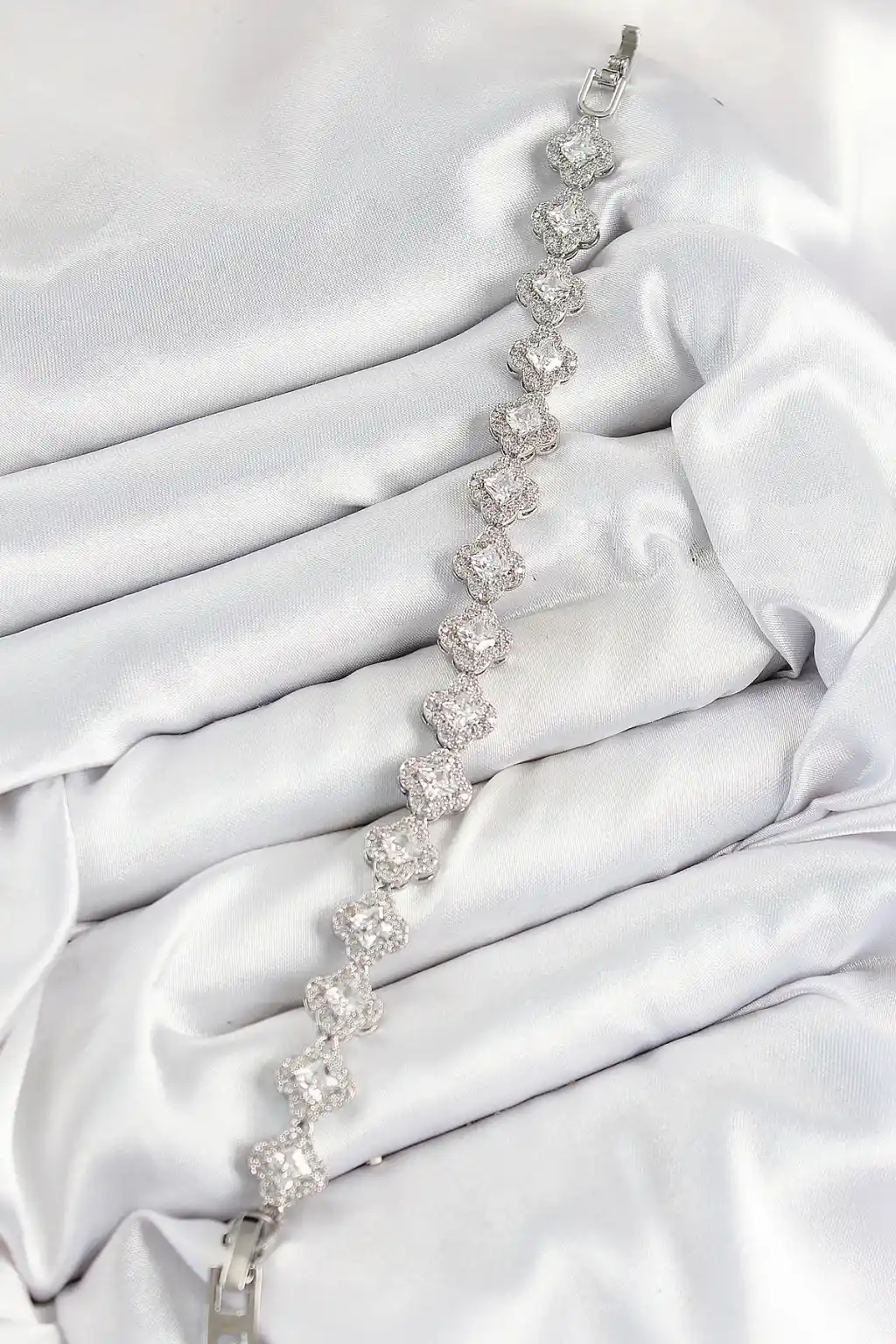 Pirinç Zirkon Taşlı Yonca Baget Model Gümüş Renk VIP Seri Kadın Bileklik