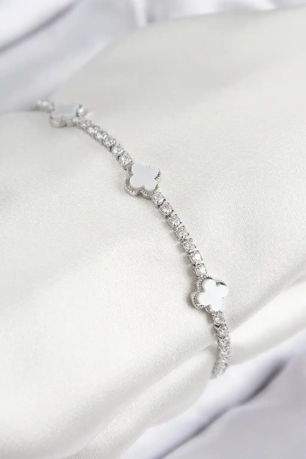 Pirinç Zirkon Taşlı Yonca Model Gümüş Renk Kadın Bileklik