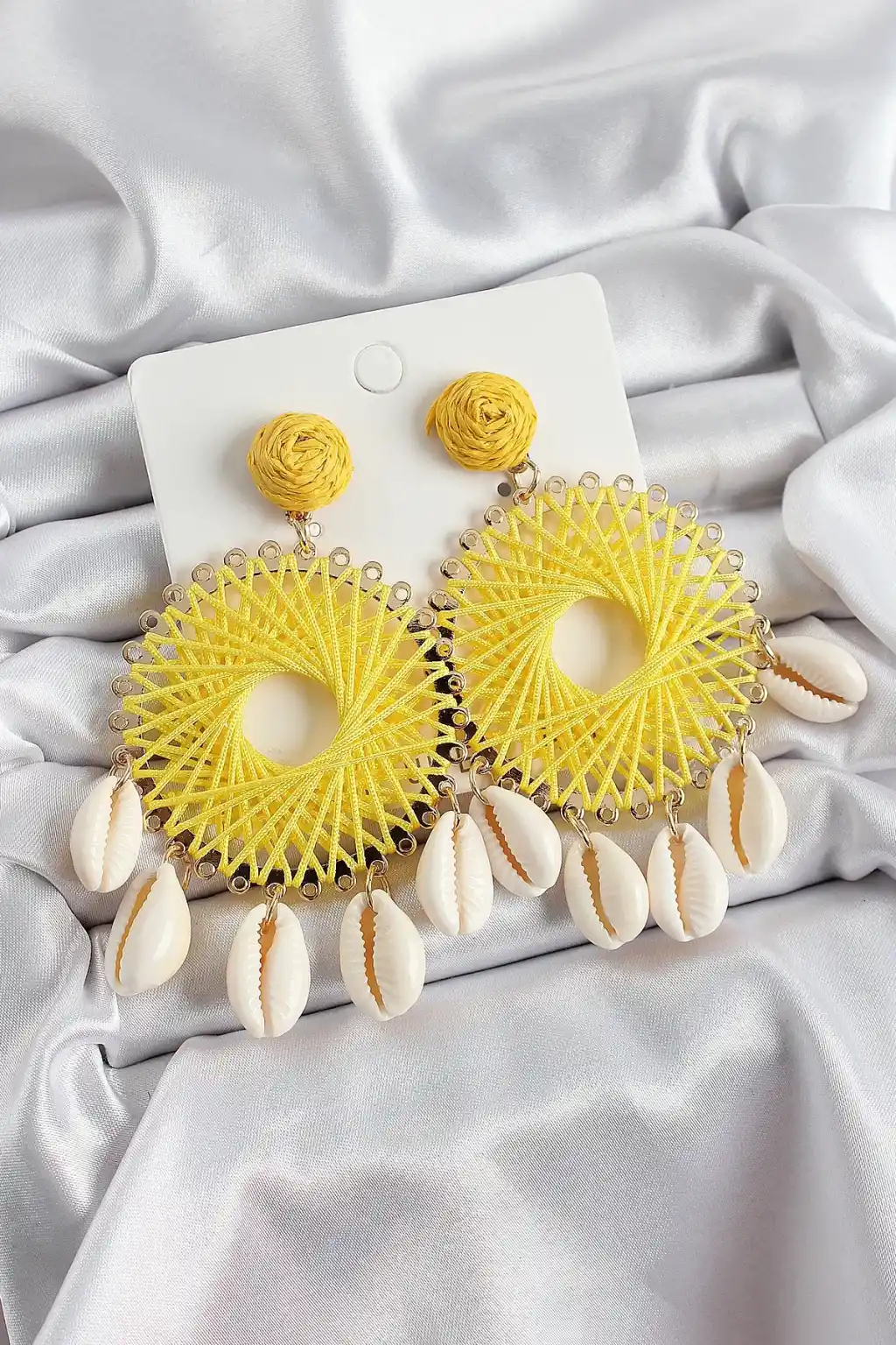 Sarı Hasır Örgü Sarmal Model Sallantılı Deniz Kabuğu Detaylı Gold Renk Kadın Küpe