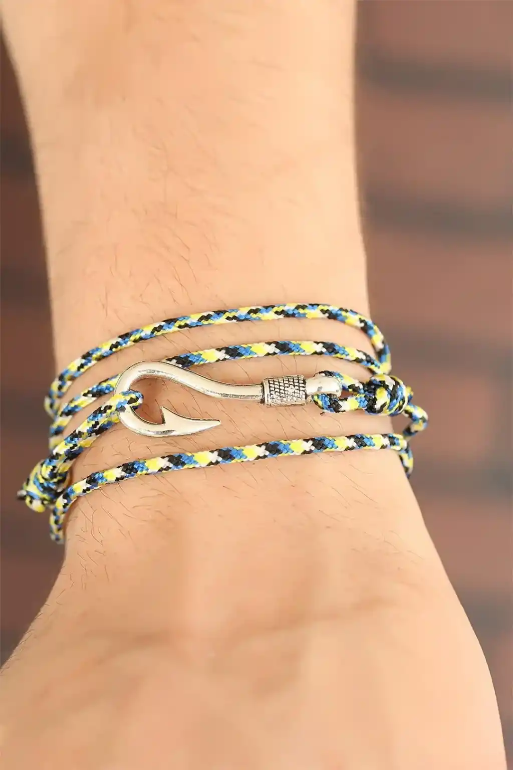 Sarı Mavi Çizgi Desenli Gümüş Renk Metal Kancalı Erkek Bileklik