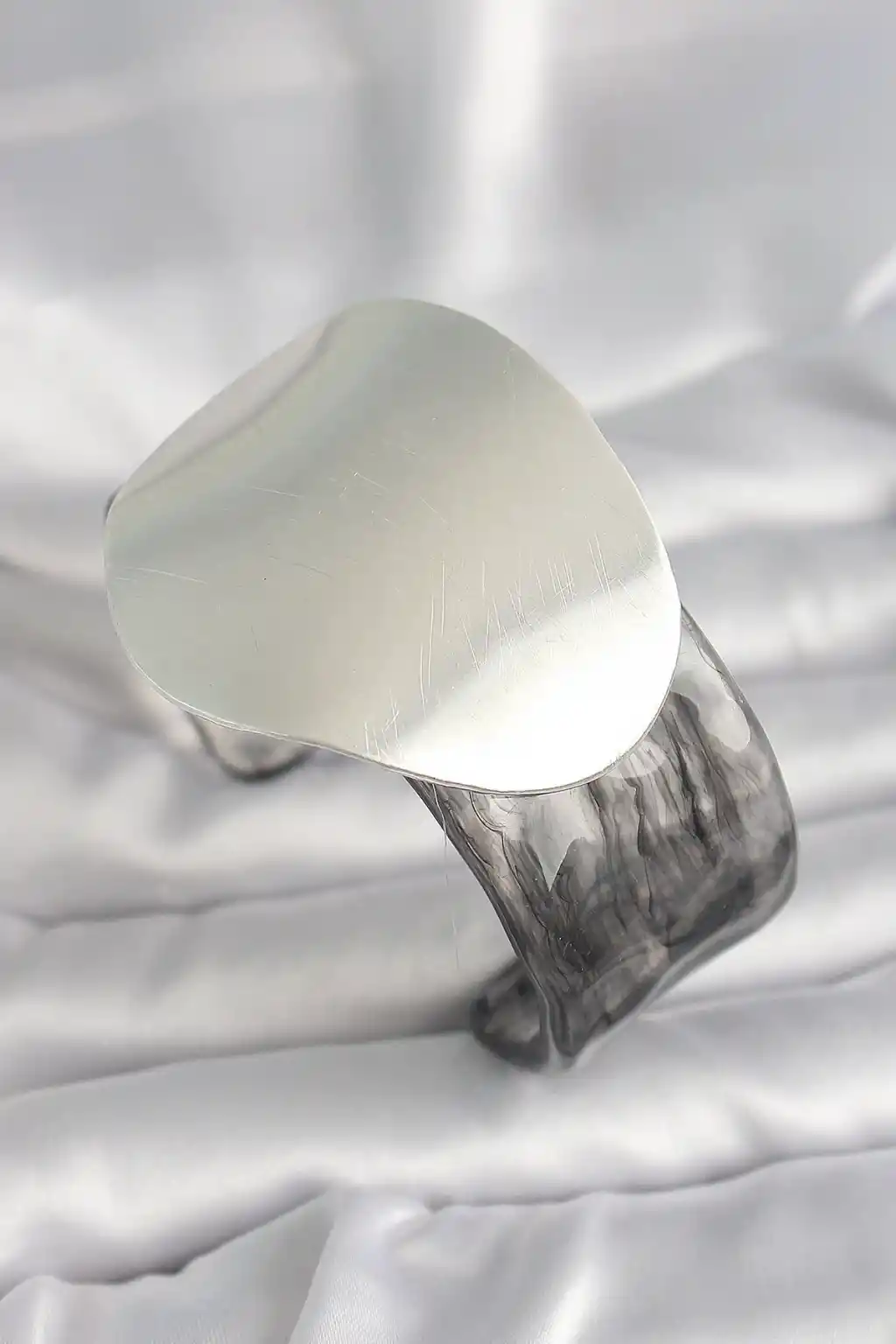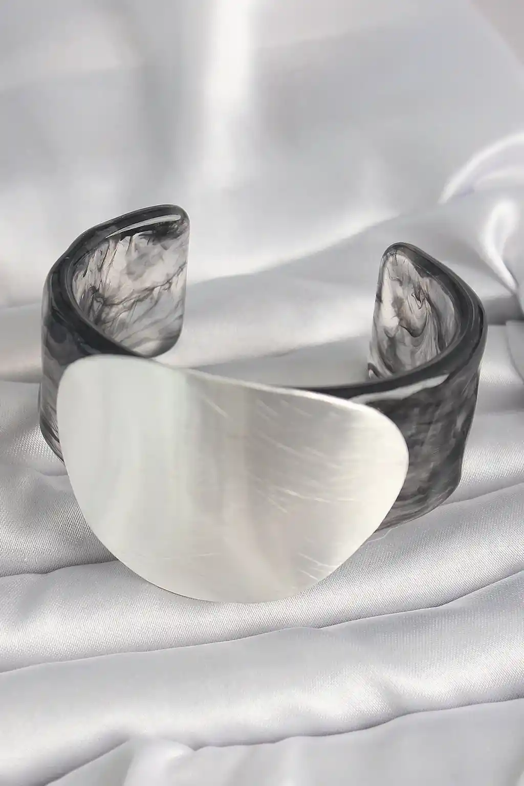Siyah Mermer Desen Akrilik Pilastik Gümüş Plaka Model Vintage Kadın Bilezik