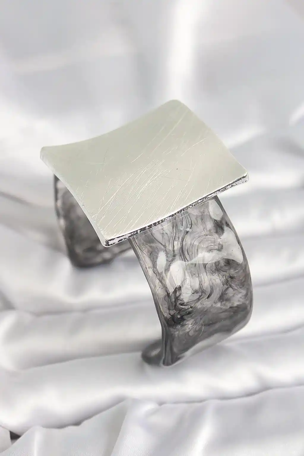 Siyah Mermer Desen Akrilik Plastik Gümüş Kare Plaka Model Vintage Kadın Bilezik
