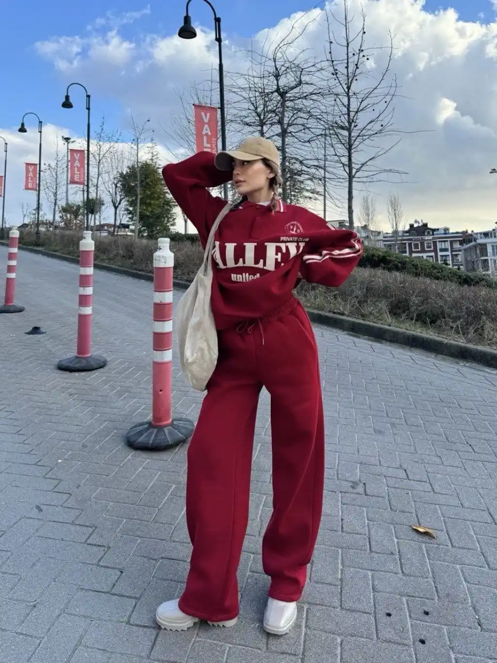 Üç İplik Yakalı Sweat Baggy Pantalonlu Takım - Bordo