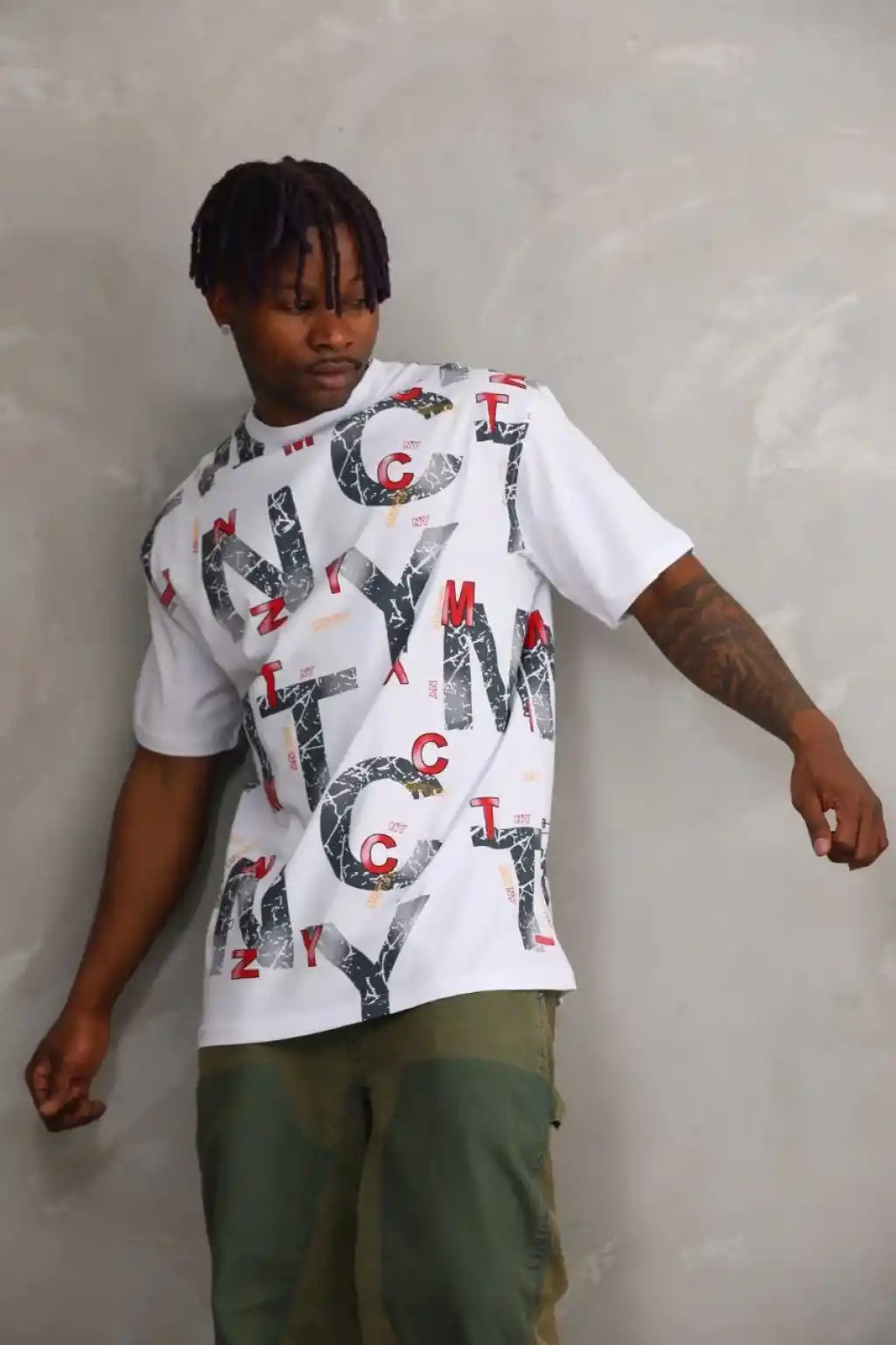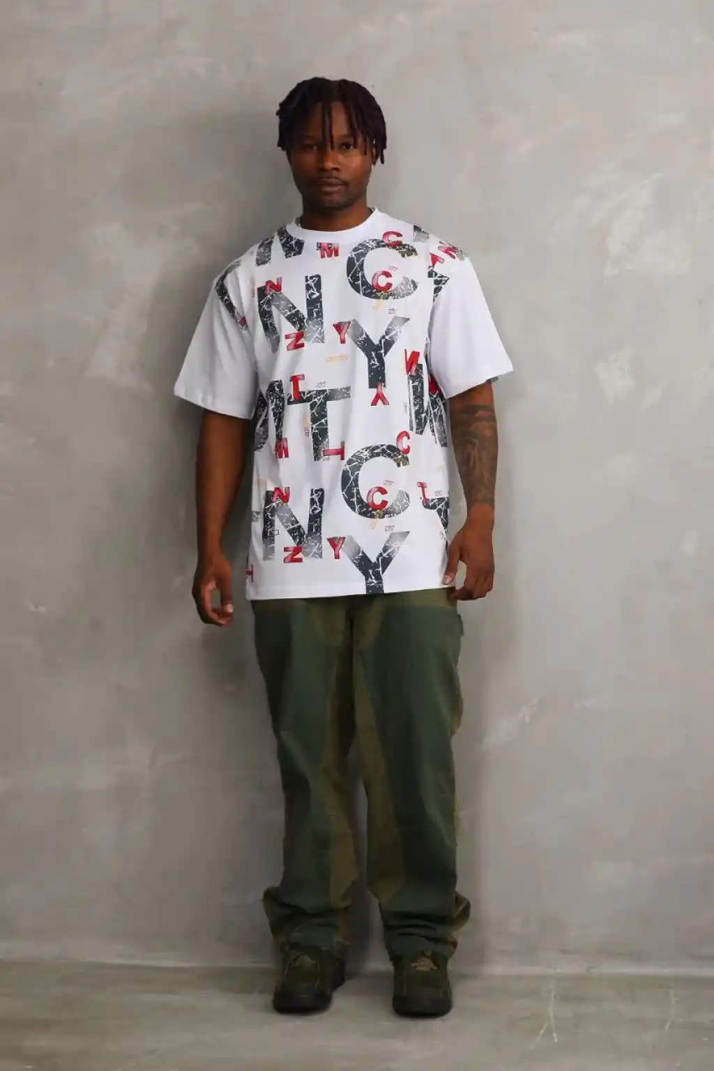 Erkek OversizeGrafik Tişört "CAMPBRASTCOOPERATION" Kalın Yazı Bisiklet Yaka, Kısa Kol, Kalın Mor ve Siyah Desenli Yazlık Sokak Kıyafeti - Beyaz