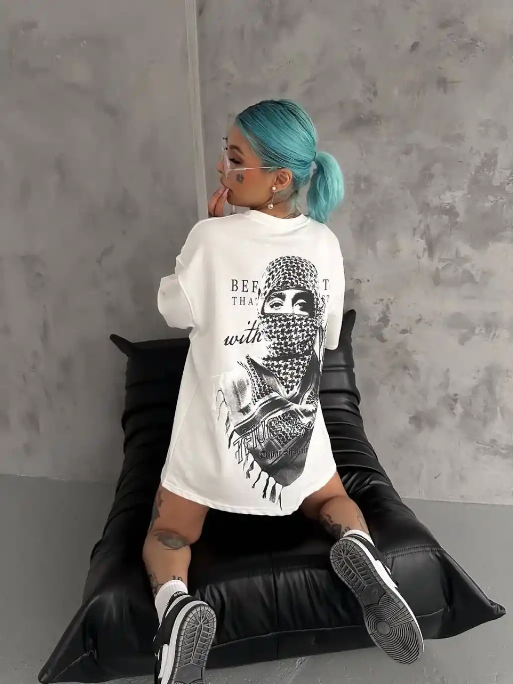Unisex Baskılı Oversize T-Shirt - Beyaz