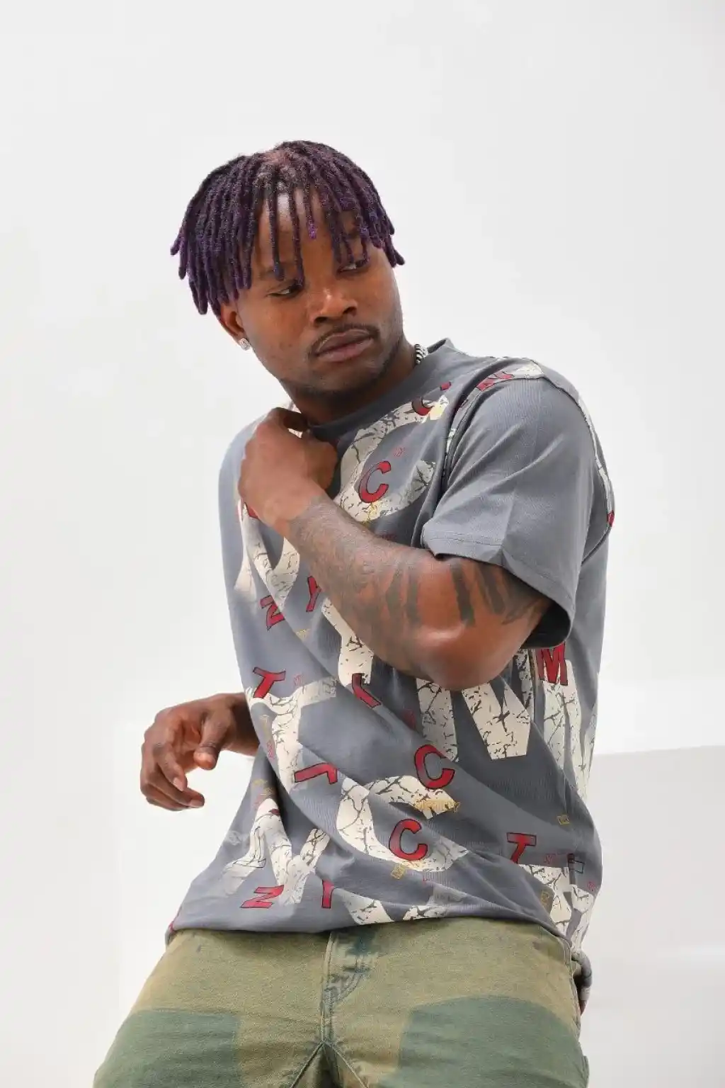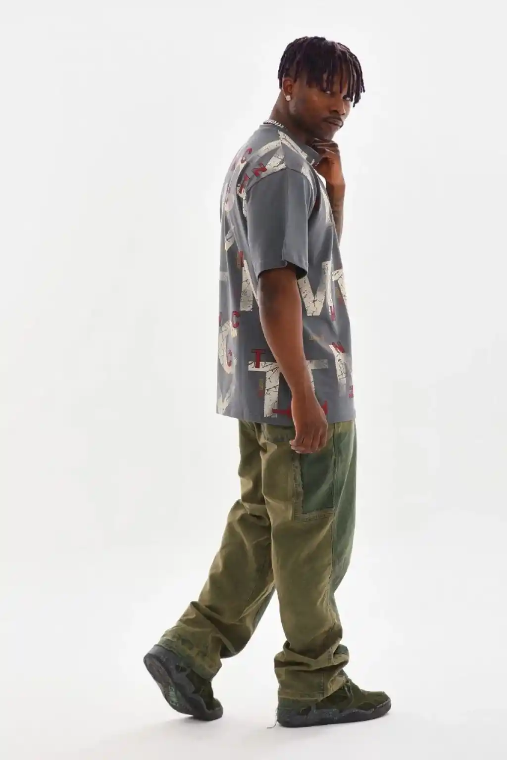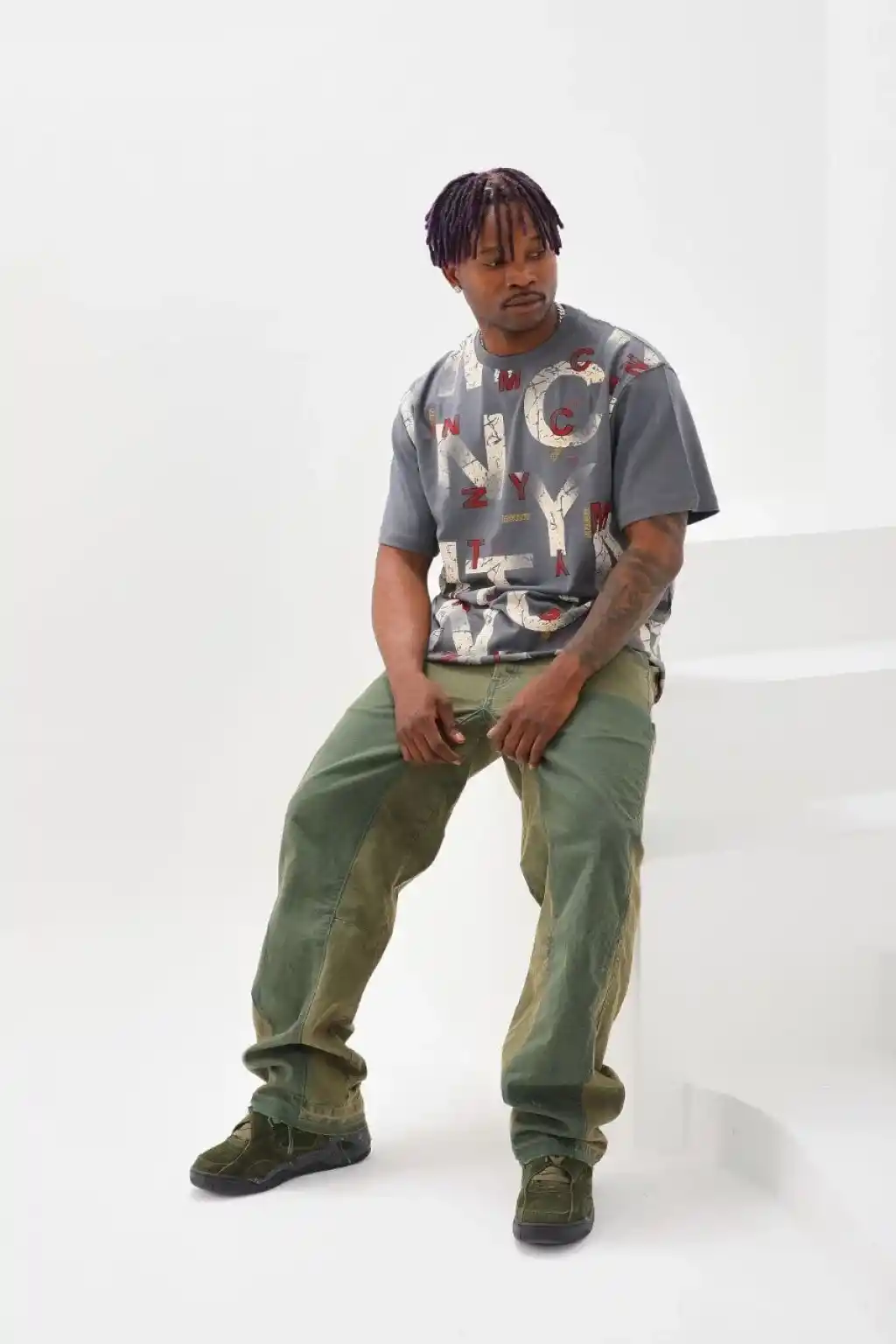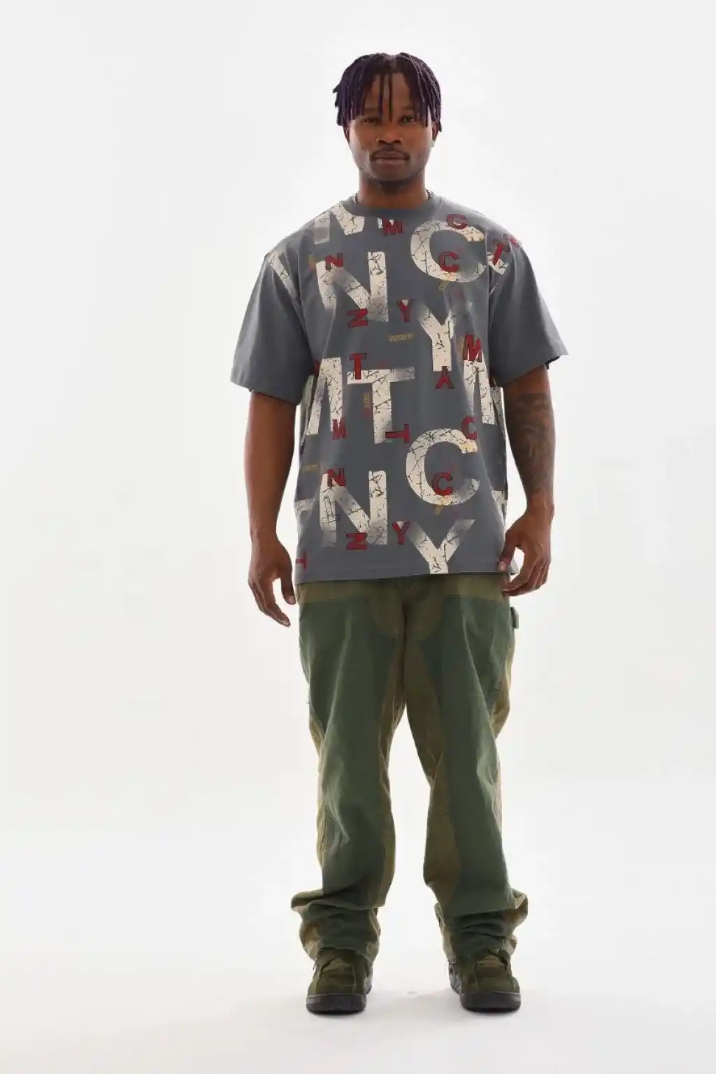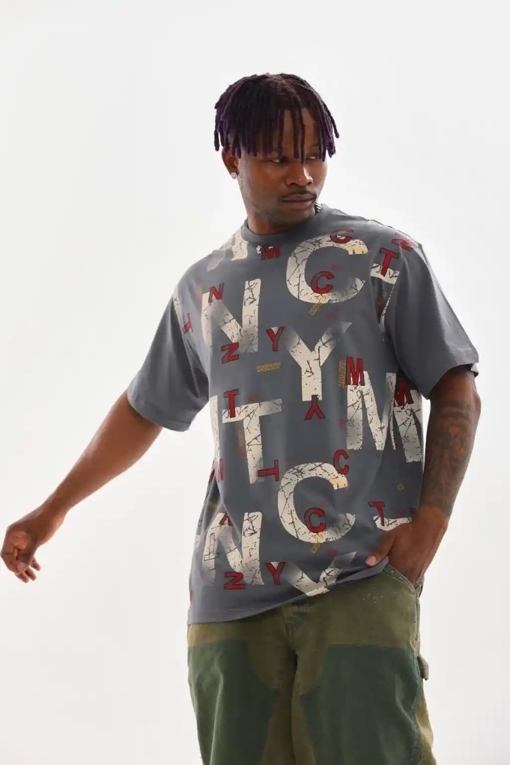 Erkek OversizeGrafik Tişört "CAMPBRASTCOOPERATION" Kalın Yazı Bisiklet Yaka, Kısa Kol, Kalın Mor ve Siyah Desenli Yazlık Sokak Kıyafeti - Siyah