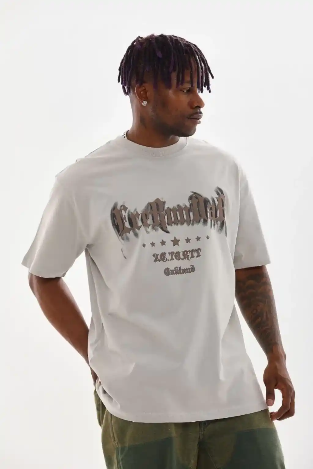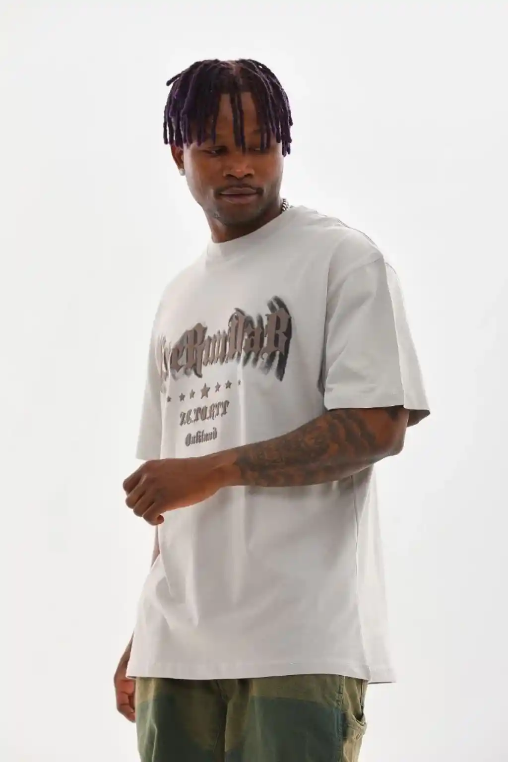 Erkek OversizeGrafik Tişört "CAMPBRASTCOOPERATION" Kalın Yazı Bisiklet Yaka, Kısa Kol, Kalın Mor ve Siyah Desenli Yazlık Sokak Kıyafeti - Beyaz