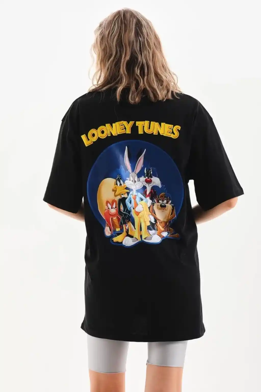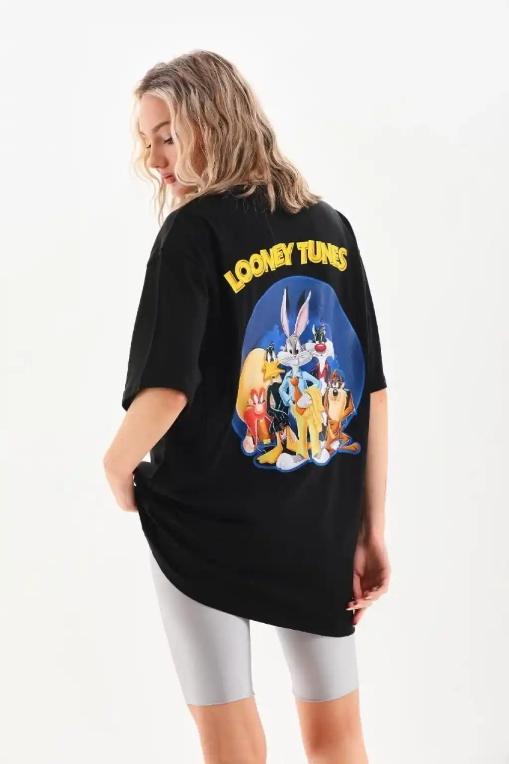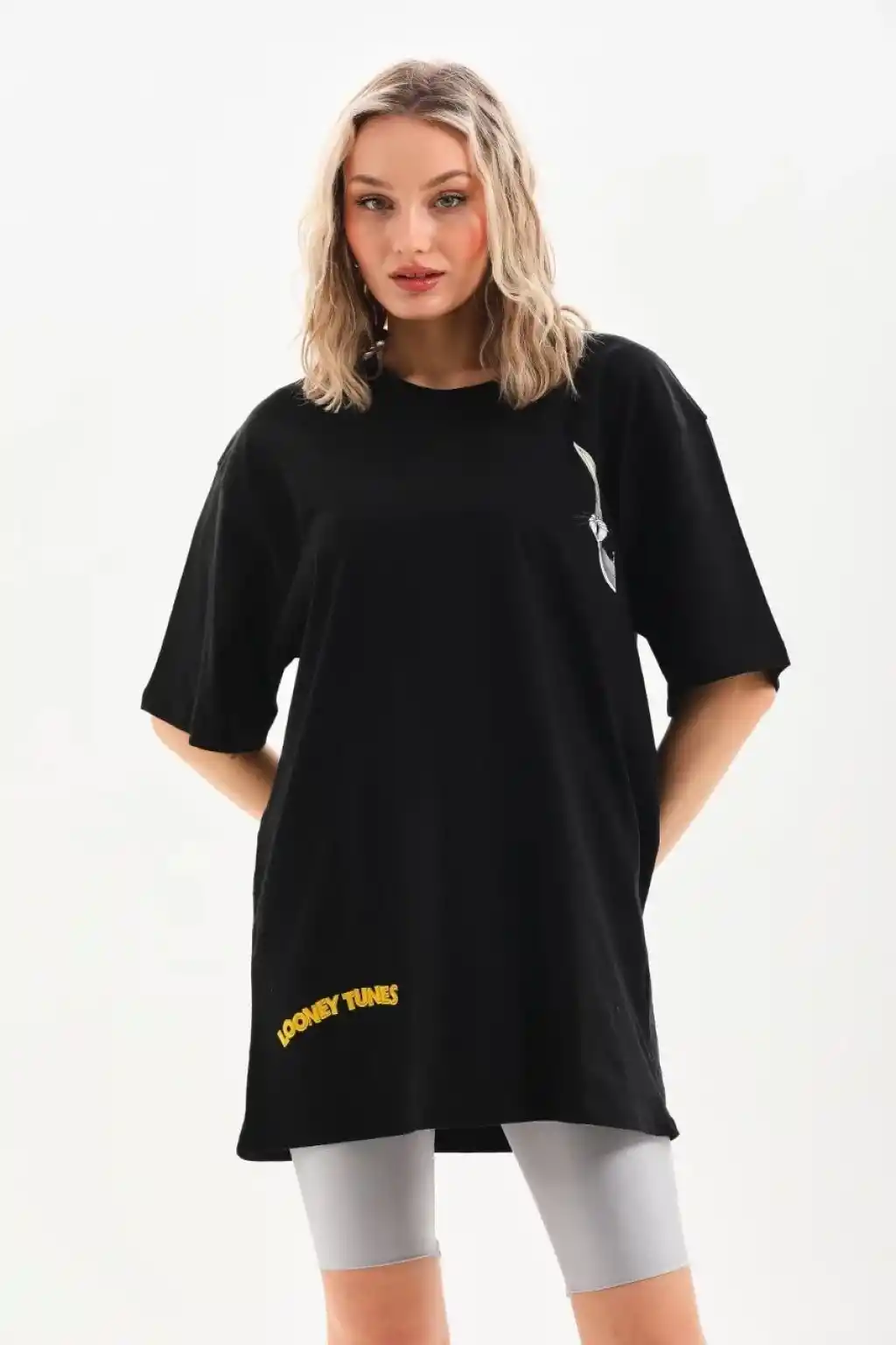 AICG Ön Arka Baskılı Bisiklet Yaka Kadın Oversize Bisiklet Yaka T-shirt - Siyah