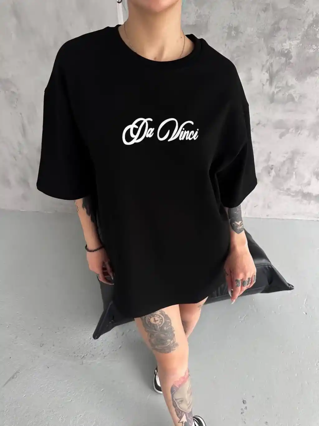 AICG Ön Arka Baskılı Bisiklet Yaka Kadın Oversize Bisiklet Yaka T-shirt - Siyah