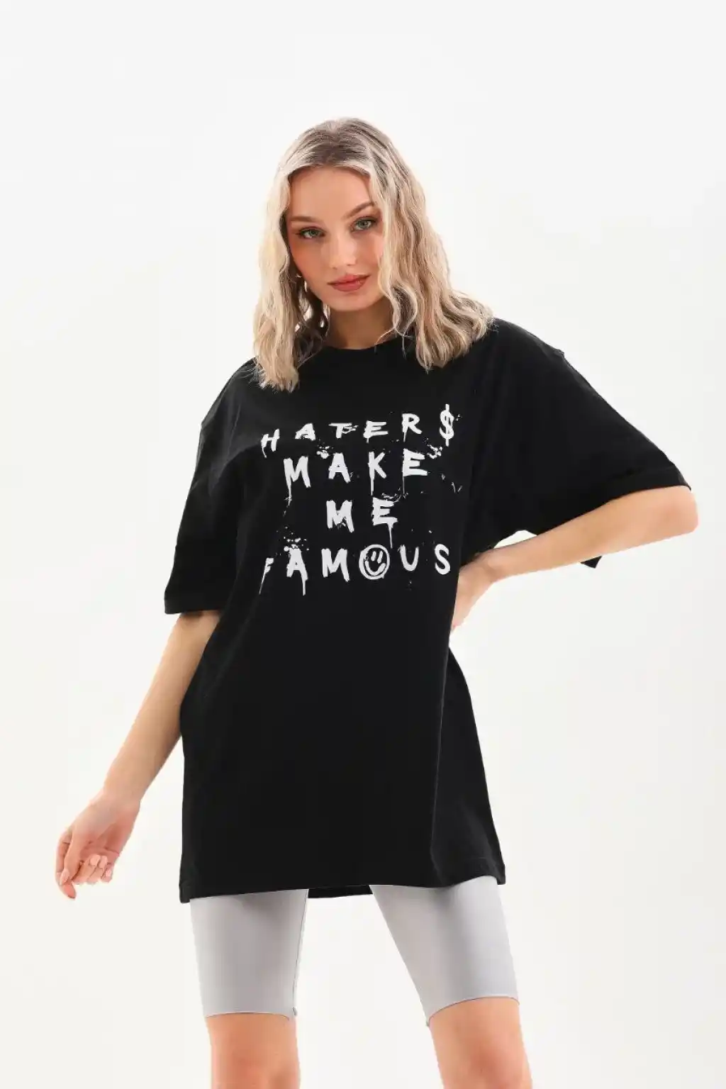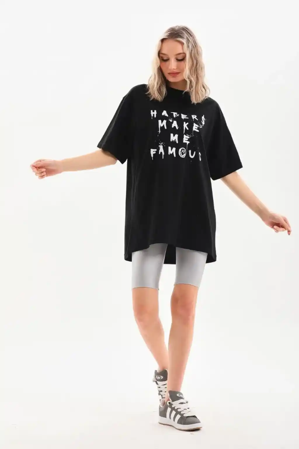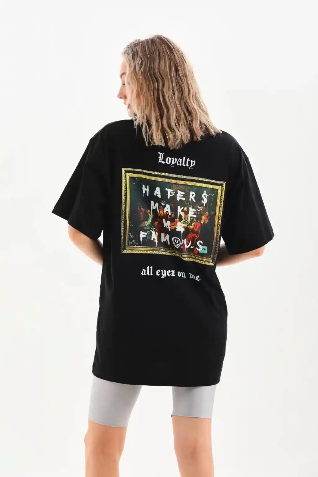AICG Ön Arka Baskılı Bisiklet Yaka Kadın Oversize Bisiklet Yaka T-shirt - Siyah