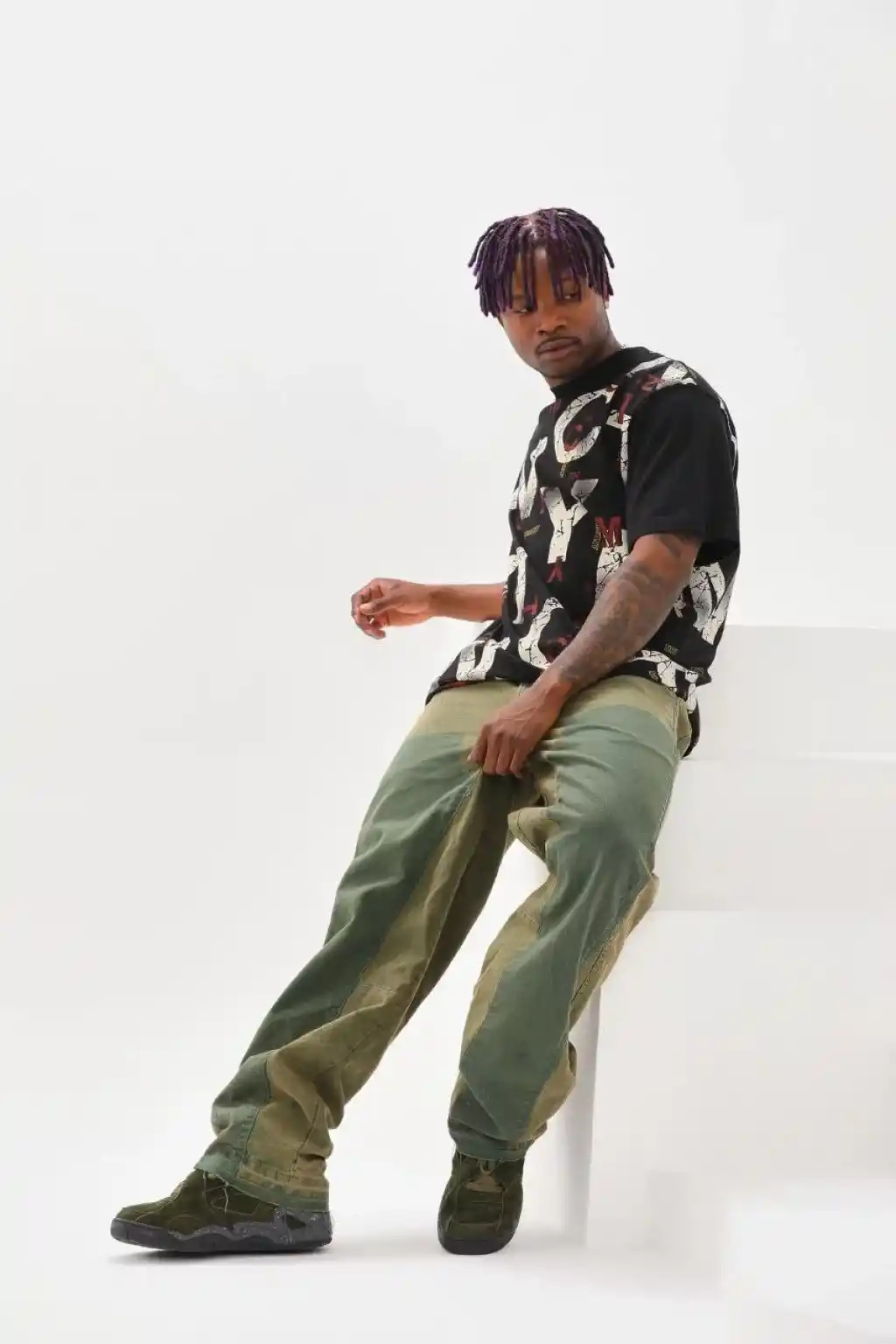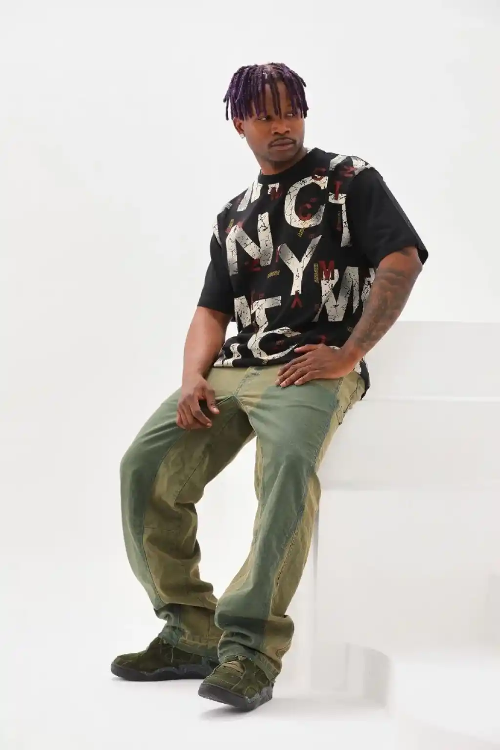 Erkek OversizeGrafik Tişört "CAMPBRASTCOOPERATION" Kalın Yazı Bisiklet Yaka, Kısa Kol, Kalın Mor ve Siyah Desenli Yazlık Sokak Kıyafeti - Siyah
