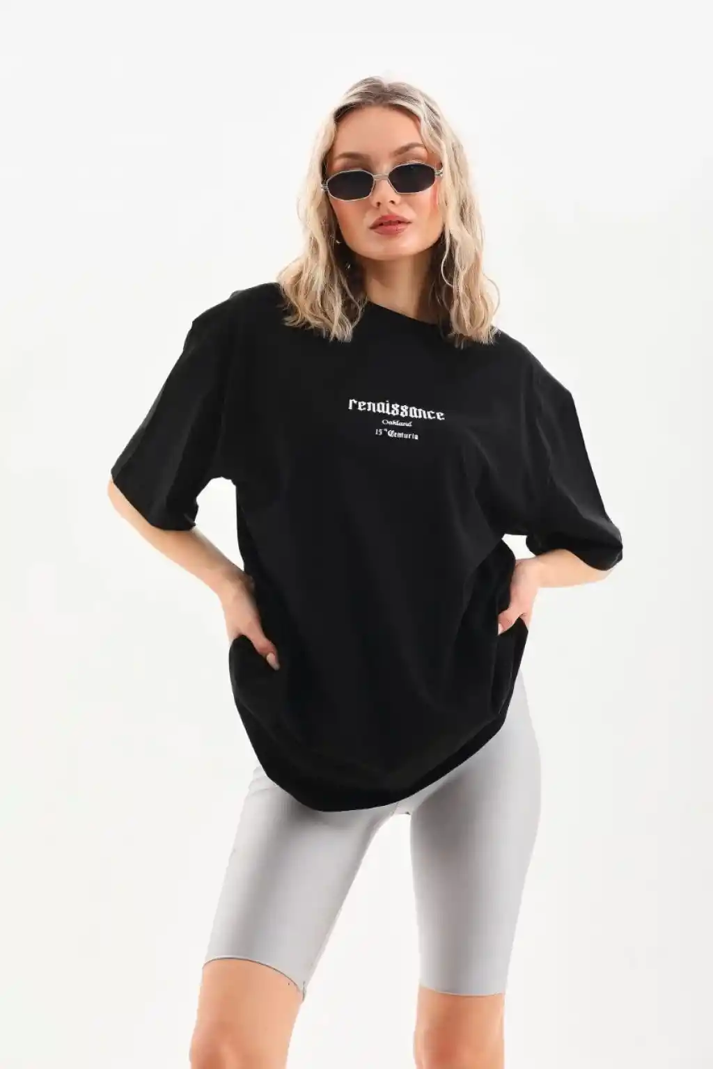 Unisex Baskılı Oversize T-Shirt - Siyah