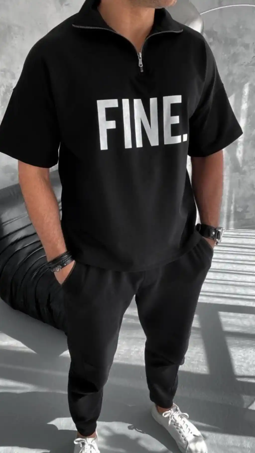 Unisex Baskılı Yarım Fermuarlı T-Shirt - Siyah