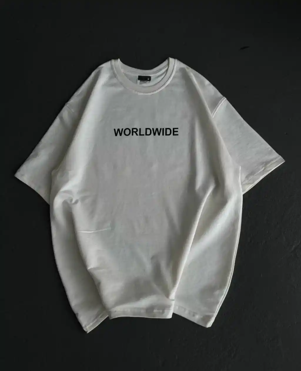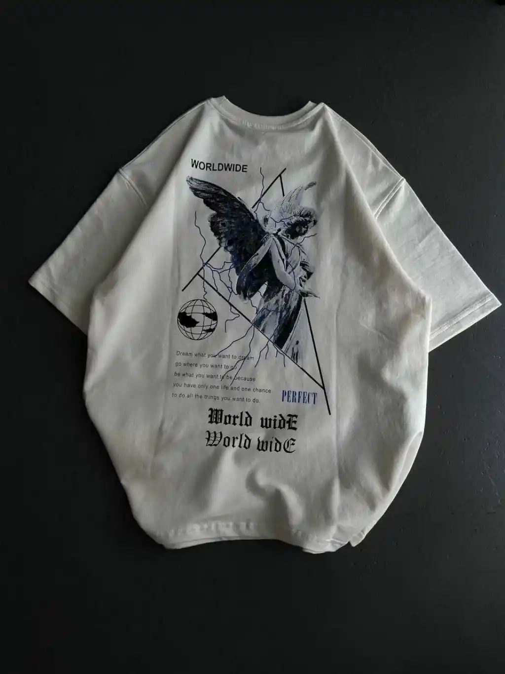 Unisex Bisiklet Yaka Baskılı Oversize T-Shirt - Beyaz