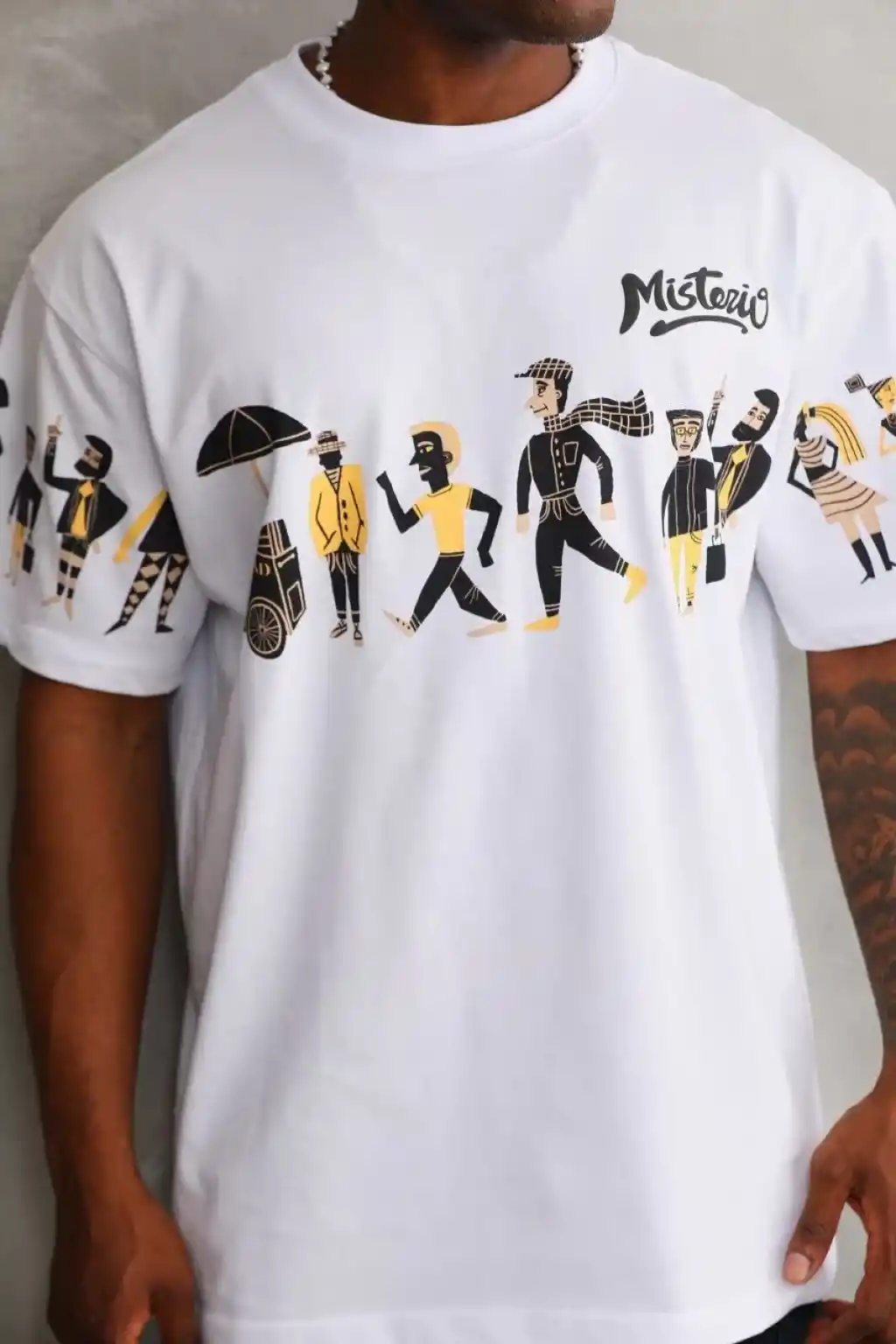 Unisex Bisiklet Yaka Baskılı Oversize T-Shirt - Beyaz
