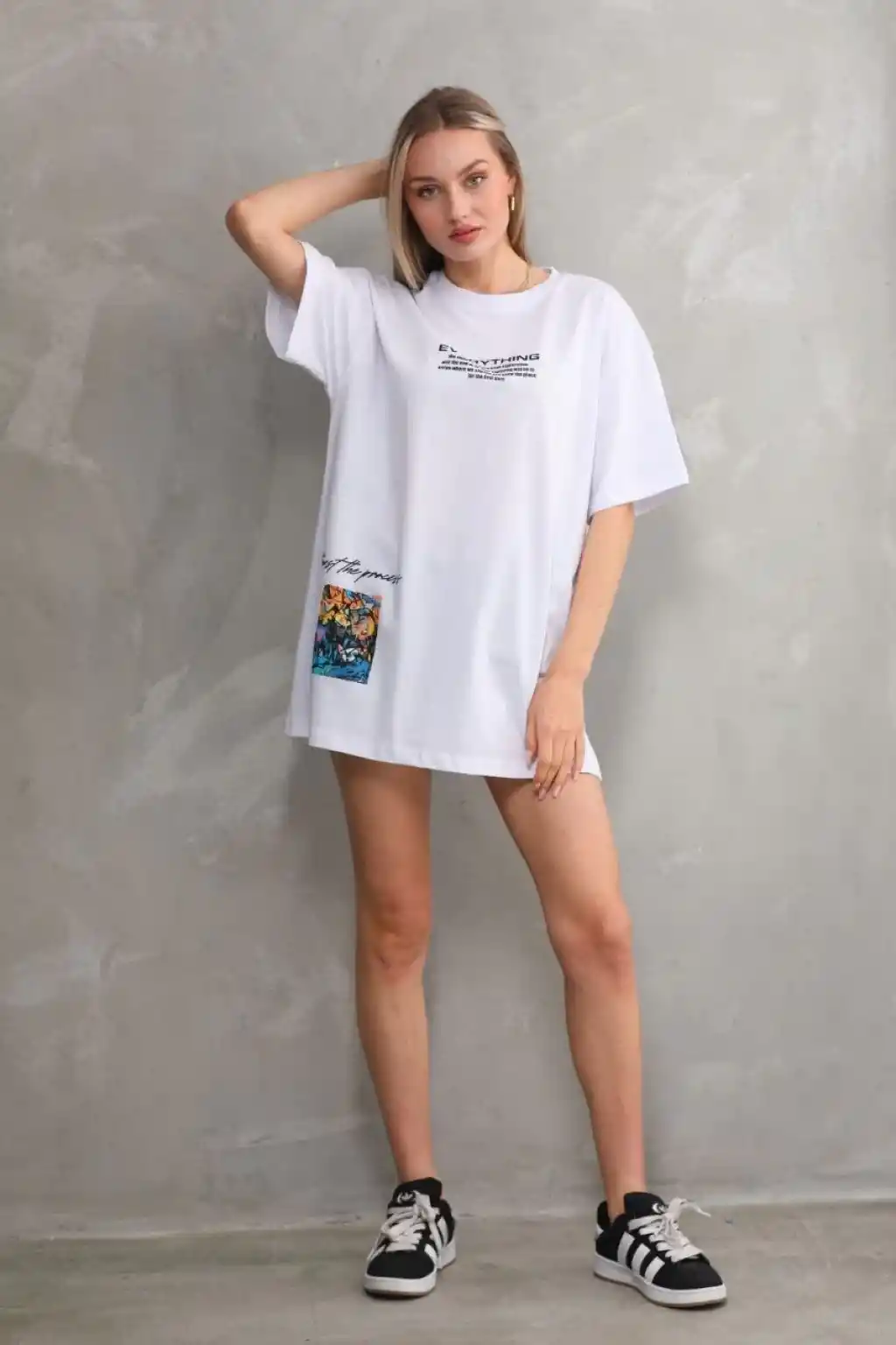 AICG Ön Arka Baskılı Bisiklet Yaka Kadın Oversize Bisiklet Yaka T-shirt - Beyaz