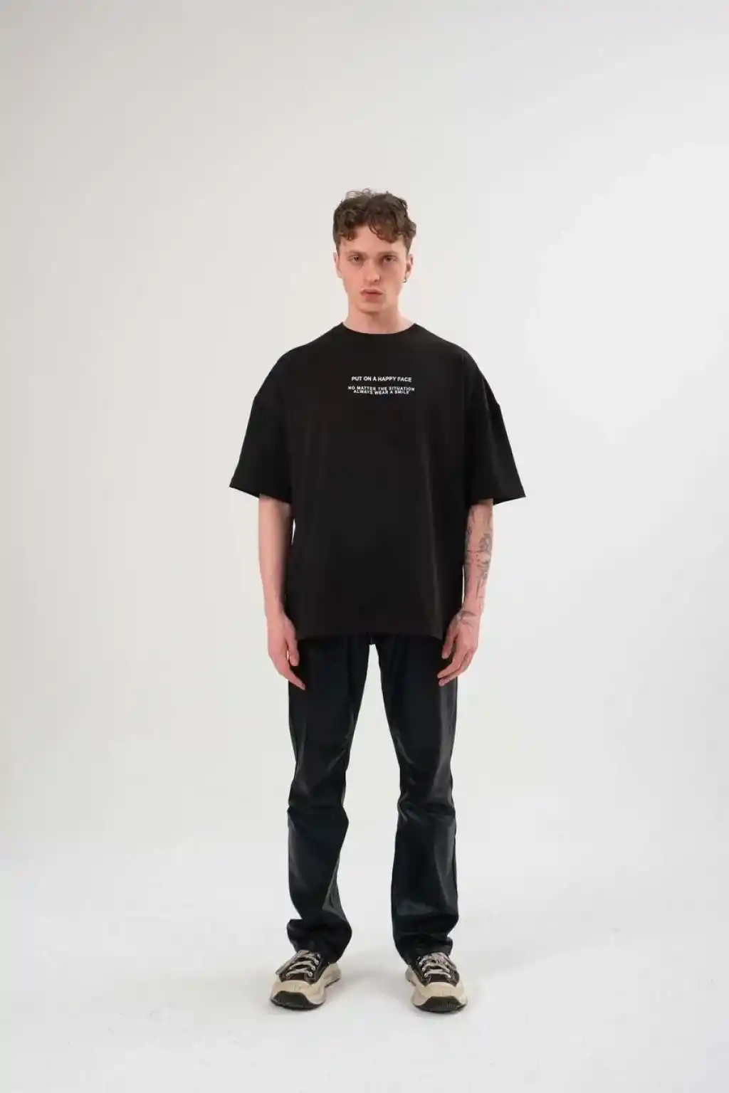 Unisex Bisiklet Yaka Baskılı Oversize T-Shirt - Siyah
