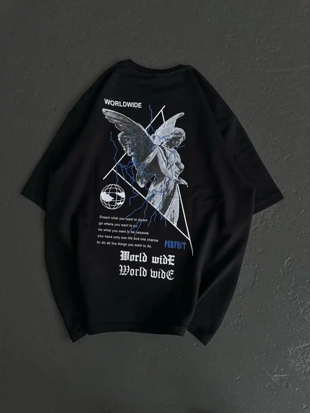 Unisex Bisiklet Yaka Baskılı Oversize T-Shirt - Siyah