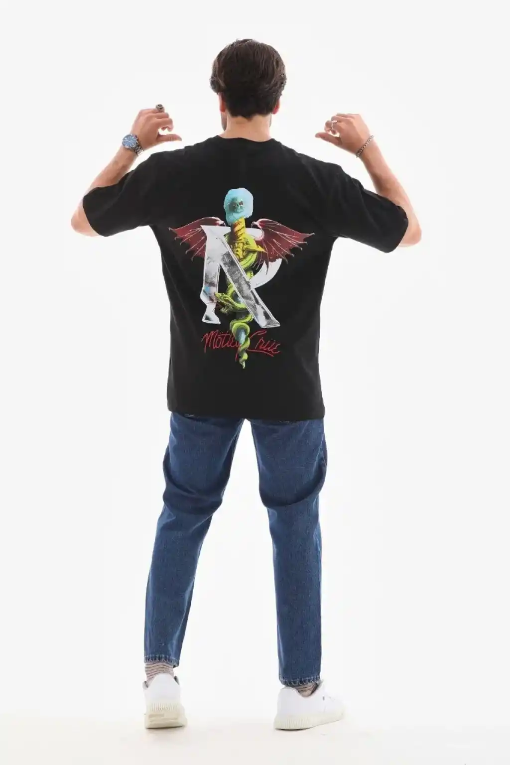 Unisex Bisiklet Yaka Baskılı Oversize T-Shirt - Siyah