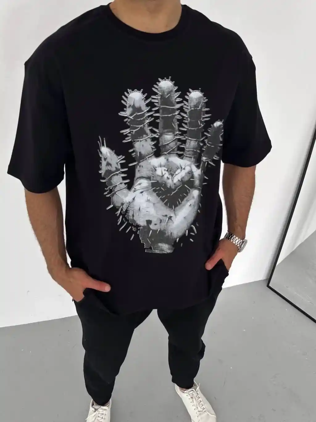 Unisex Bisiklet Yaka Baskılı Oversize T-Shirt - Siyah