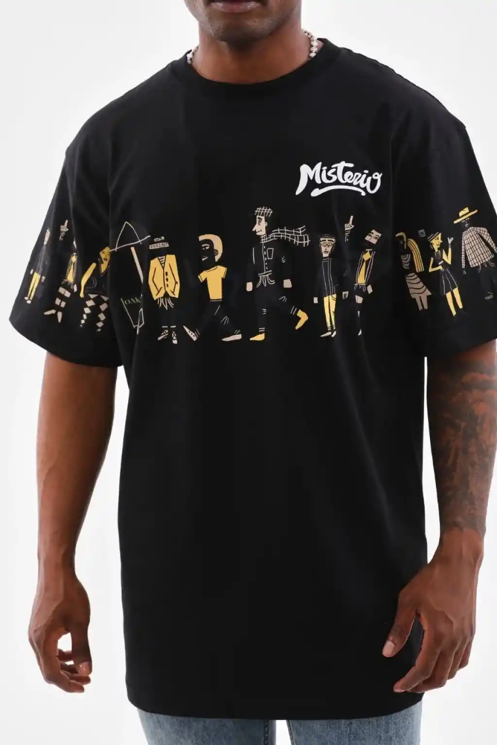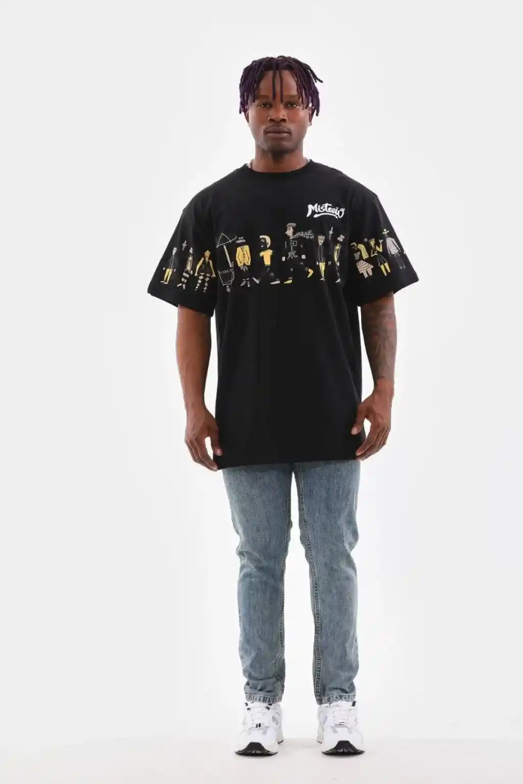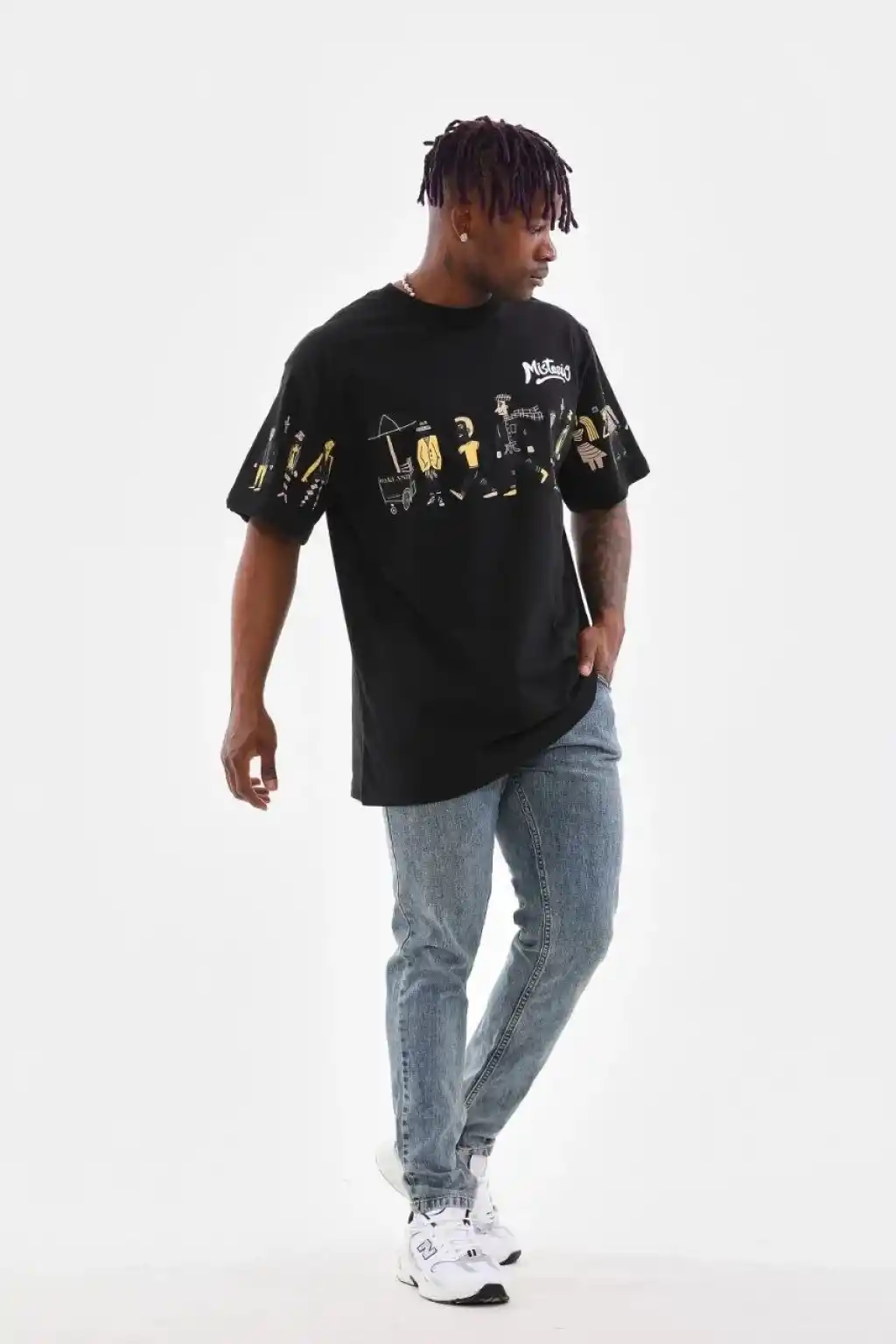 Unisex Bisiklet Yaka Baskılı Oversize T-Shirt - Siyah