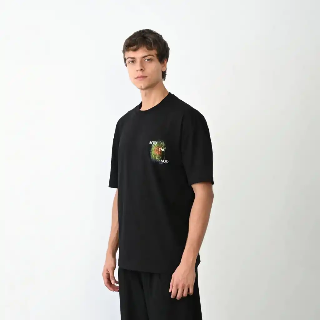 Unisex Bisiklet Yaka Baskılı Oversize T-Shirt - Siyah