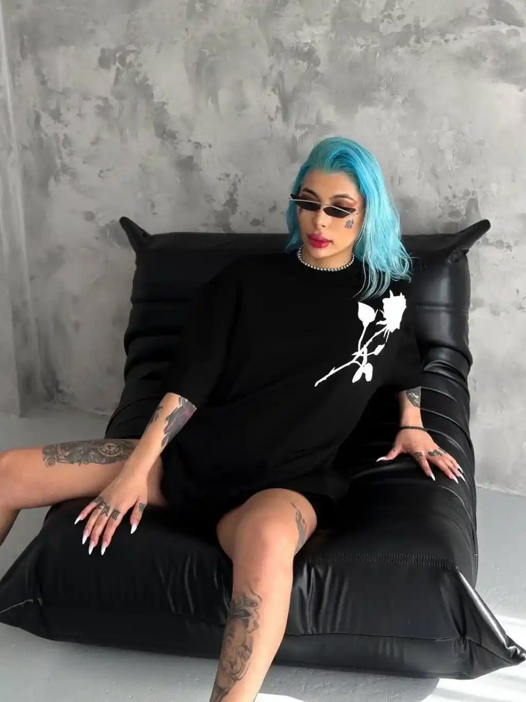 AICG Ön Arka Baskılı Bisiklet Yaka Kadın Oversize Bisiklet Yaka T-shirt - Siyah