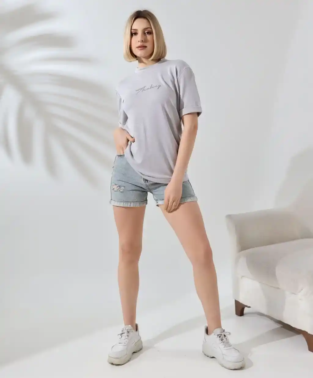 Unisex Bisiklet Yaka Baskılı Slim Fit T-Shirt - Boyalı Gri