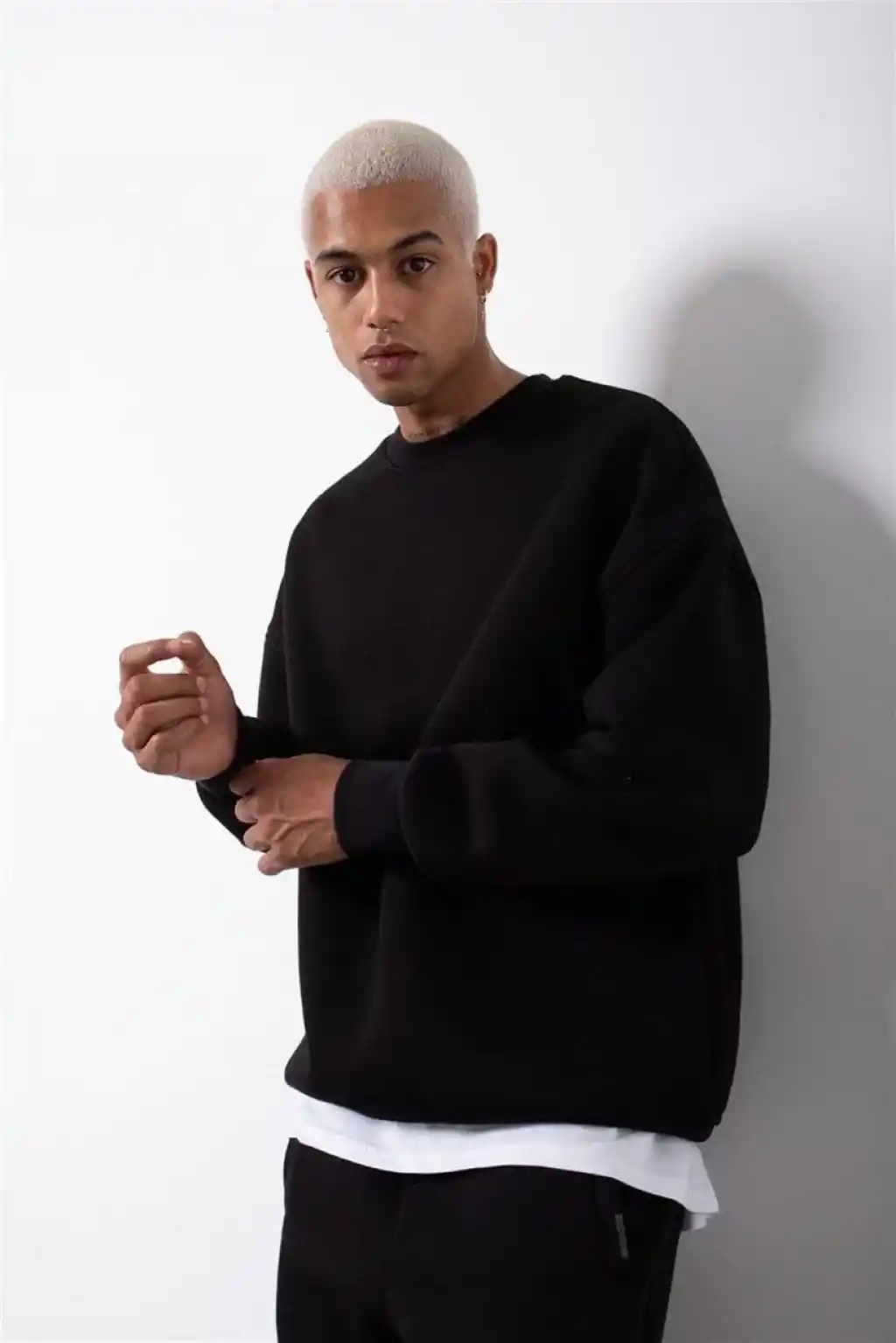 Unisex Biskilet Yaka Üç İplik SweatShirt - Siyah