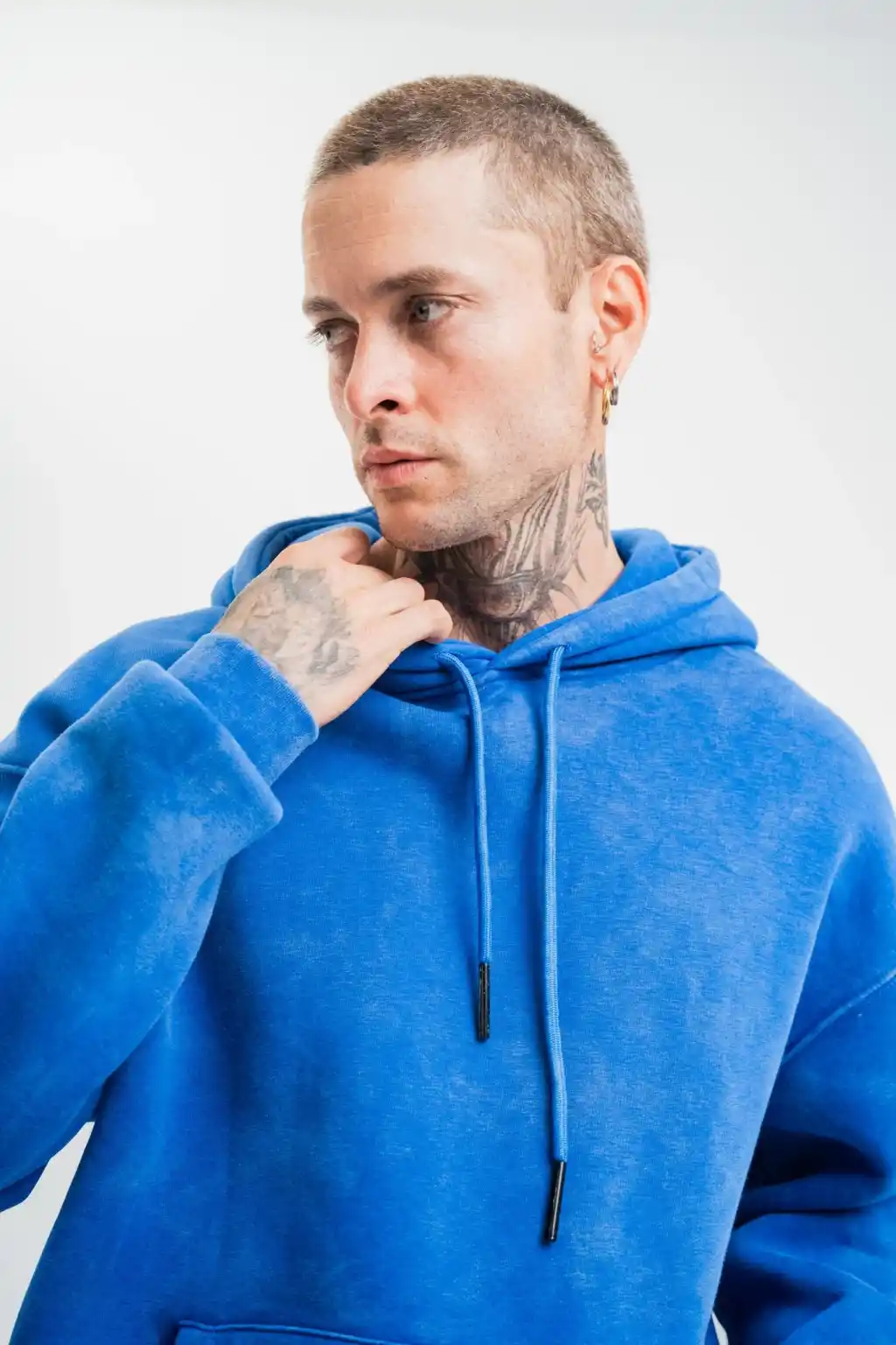 Unisex Double Oversize Kapşonlu Yıkamalı SweatShirt - Mavi