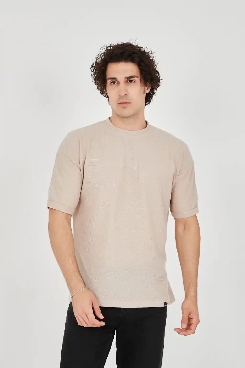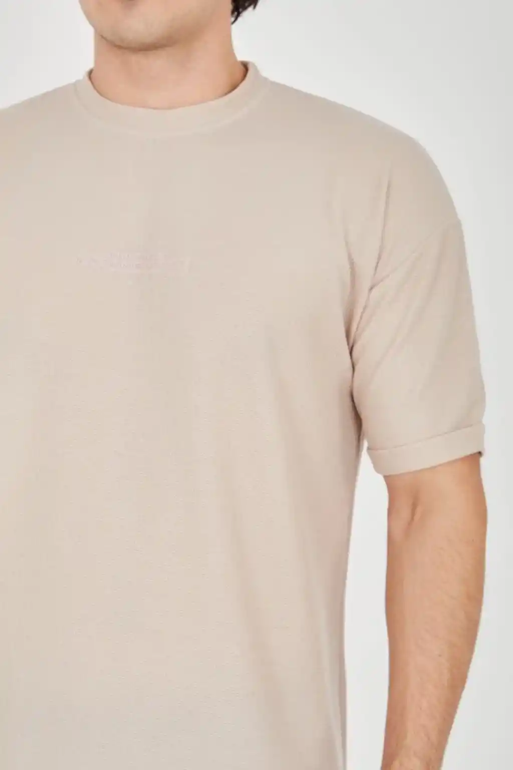 Unisex Jakar Kumaş Rahat Kol T-Shirt - Bej
